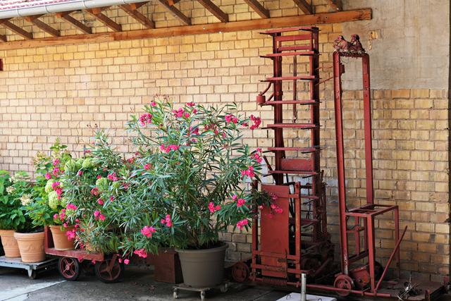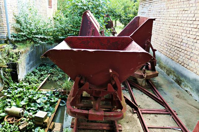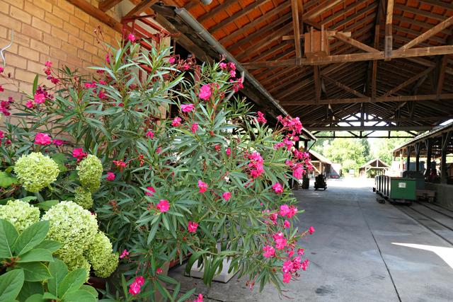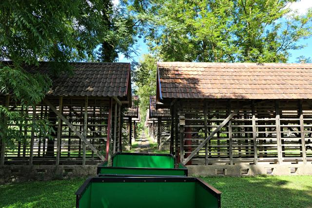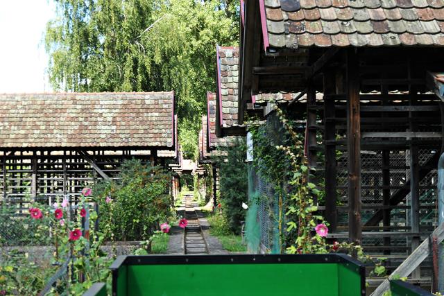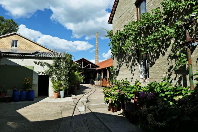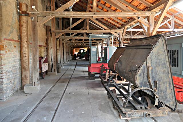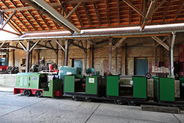 Zuerst fuhren wir mit einer Schmalspurbahn, die heute als kleine Attraktion gerne genutzt wird, durch das Gelände, um einen Einblick von dem Areal zu bekommen. Diese Bahn wurde ursprünglich dazu genutzt, die Backsteine in die Trocknungshütten zu transportieren und Lehm in die Fabrik zu transportieren. Dort wurden sie zwischengelagert bis der erforderliche Trocknungsgrad für den Brand erreicht war. Wir sahen in der ca. 5-minütigen Fahrt viel Natur, Scheunen, Fahrzeuge, Geräte und Tiere.
