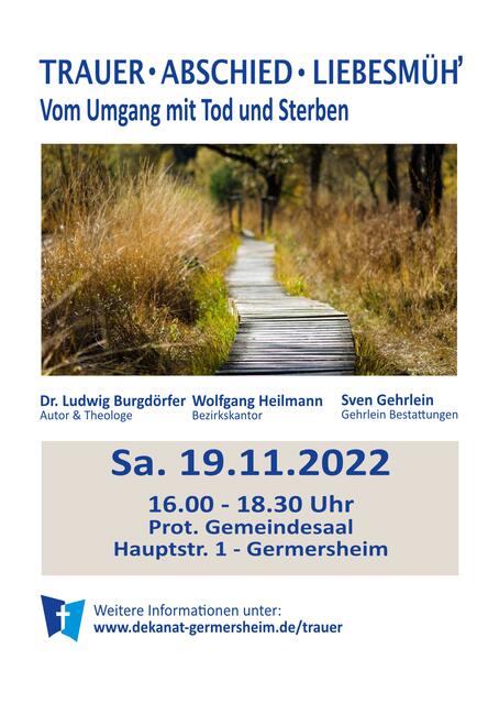 Vorab findet am Samstag, den 19. November 2022 von 16:00 Uhr bis 18:30 Uhr im Protestantischen Gemeindehaus Germersheim eine Auftaktveranstaltung statt. Zum Thema „Trauer – Abschied – Liebesmüh: vom Umgang mit Tod und Trauer“ spricht der ehemalige Landauer Dekan und Leiter des Missionarisch Ökumenischen Dienstes der Pfälzischen Landeskirche, Dr. Ludwig Burgdörfer. Er hat selbst viele Jahre eine Trauergruppe in Landau geleitet und bereits mehrere Bücher zum Thema Trauer veröffentlicht. Aus Sicht eines Bestattungsunternehmens wird Sven Gehrlein über den Wandel der Bestattungskultur berichten und Antworten auf Fragen geben, die ihm als Bestatter häufig von Angehörigen gestellt werden. Im Anschluss an die beiden Vorträge besteht Zeit zum Austausch, bevor die Veranstaltung mit musikalischen Beiträgen von Bezirkskantor Wolfgang Heilmann ausklingen wird.