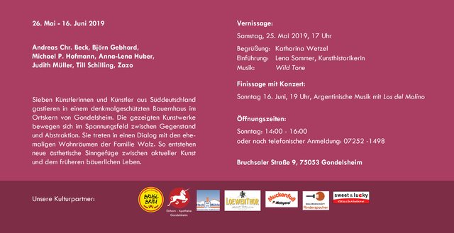 Sieben Künstlerinnen und Künstler aus Süddeutschland gastieren in einem denkmalgeschützten Bauernhaus im Ortskern von Gondelsheim. Die gezeigten Kunstwerke bewegen sich im Spannungsfeld zwischen Gegenstand und Abstraktion. Sie treten in einen Dialog mit den ehemaligen Wohnräumen der Familie Walz. So entstehen neue ästhetische Sinngefüge zwischen aktueller Kunst und dem früheren bäuerlichen Leben.