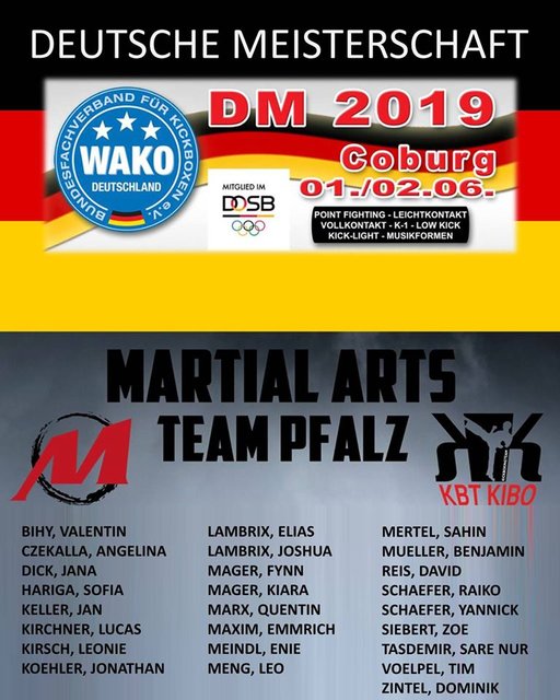 Einen wahren Medaillenregen erlebten die Kickboxer des Martial Arts Team Pfalz bei der diesjährigen Deutschen Meisterschaft der WAKO in der Coburg-Arena. Über 500 Kickboxer kämpften um den wichtigsten nationalen Titel in ihren Gewichtsklassen und 6 Titel wanderten in die Pfalz. Abgerundet wurde dieser Erfolg mit 3 Silber- und 6 Bronzemedaillen. Die Trainer Sven Mager (Kickboxingteam KIBO) und Marcel Ritter (Martial Arts Sports Center Grünstadt) durften sich über ein Team freuen, dass sich in allen Kämpfen sehr stark präsentierte.