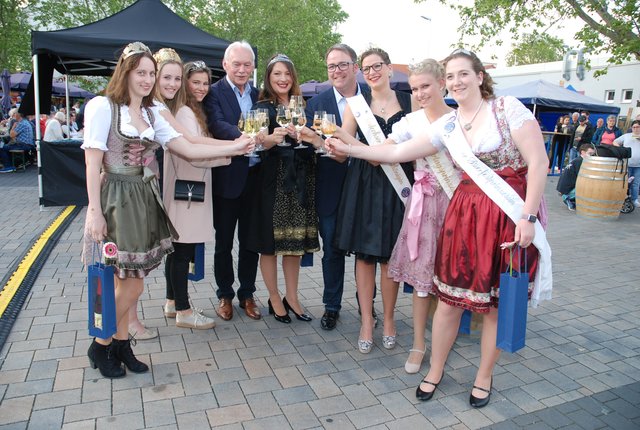 - Die Bier- und Weinhoheiten flankiert von Bürgermeister Lothar Lorch und dem 1. Beigeordneten Tobias Meyer zur Eröffnung der Leisböhler Weintage.
