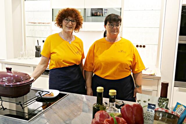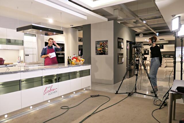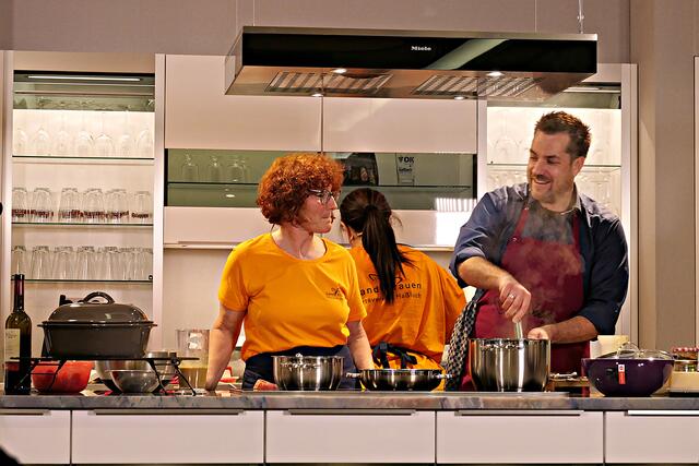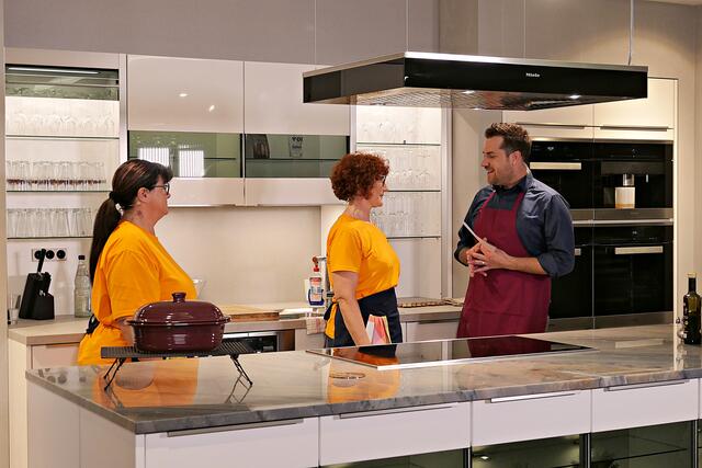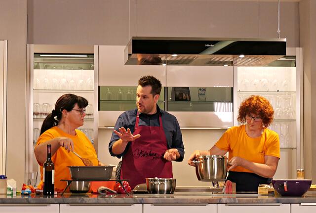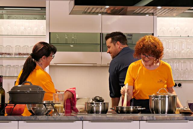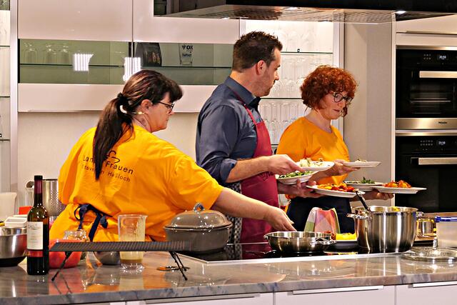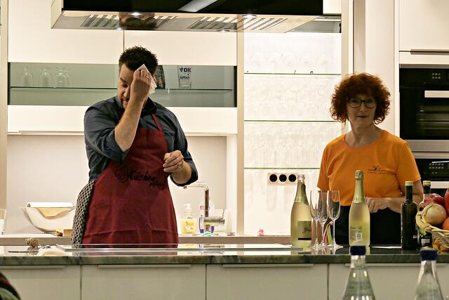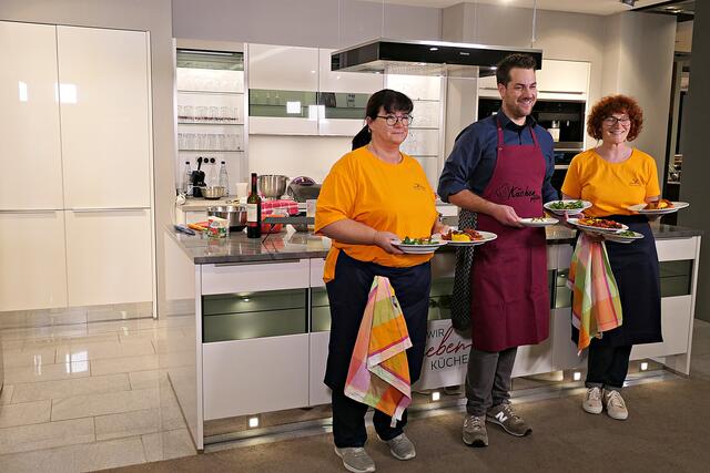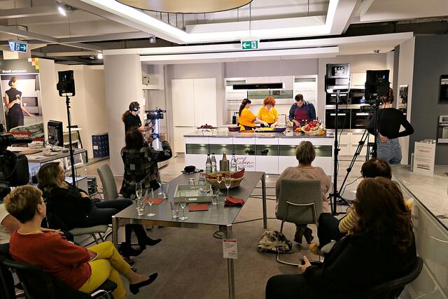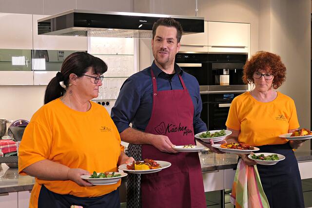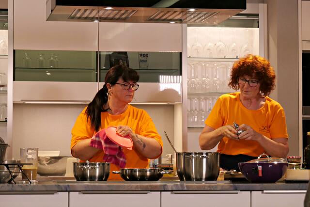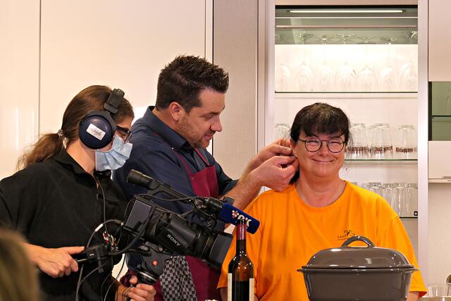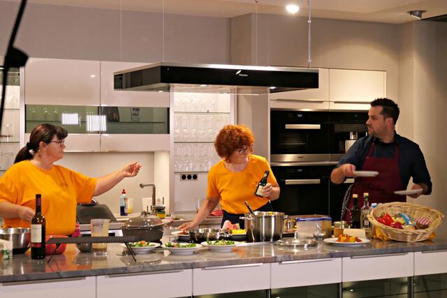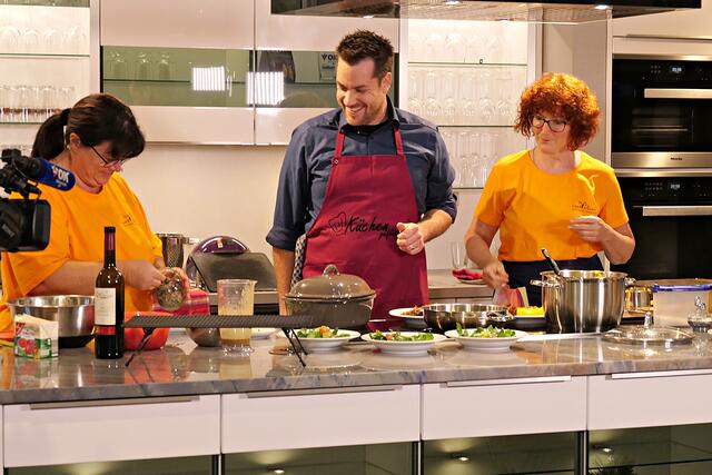 Haßloch/Speyer. Am 7. Oktober fand ein ganz besonders kulinarisches Event statt. Ab 19.00 Uhr machte sich bei StrohmeierGilb die Küchenwelt in Speyer für eine Aufzeichnung zum „Küchengeflüster mit den LandFrauen“ bereit. Das Team vom Offenen Kanal Weinstraße mit Markus Merkler als „Chefkoch“ hatte bereits Vorarbeit geleistet, den Tisch für die „geladenen“ Gäste mit Brezeln, Wasser und später auch Sekt gedeckt. Da wegen Corona die Anzahl der Zuschauer begrenzt war, kamen sechs LandFrauen aus Haßloch, um ihre beiden Köchinnen Andrea Jung und Tanja Orth zu unterstützen, sei es mit ihrer Anwesenheit oder mit Beifall.