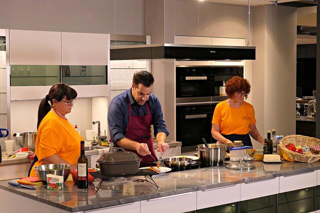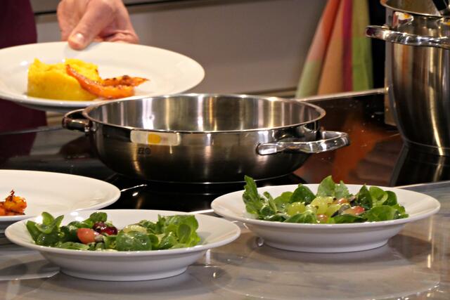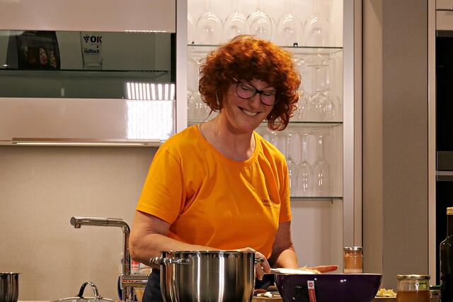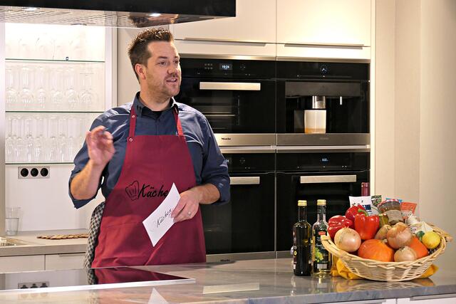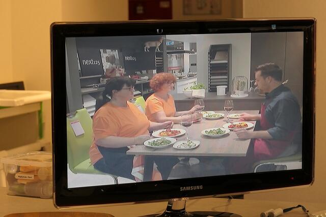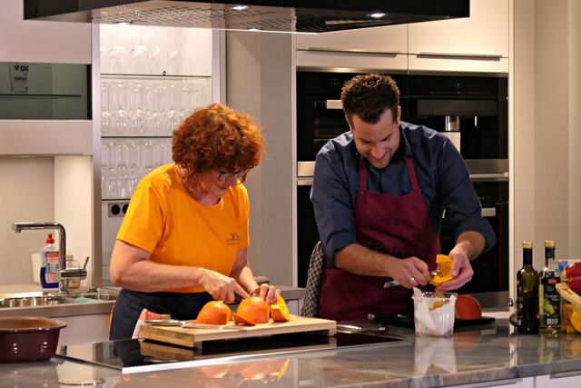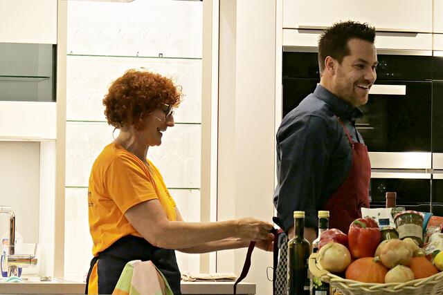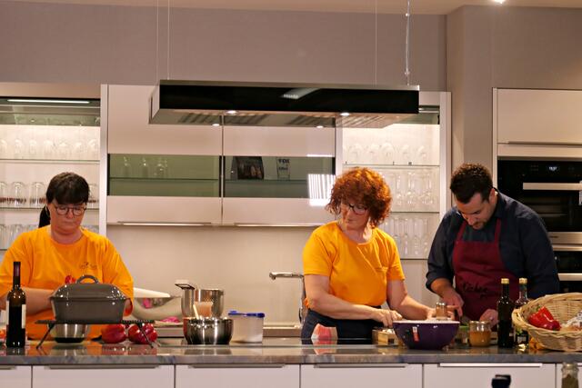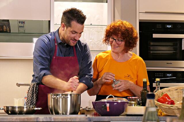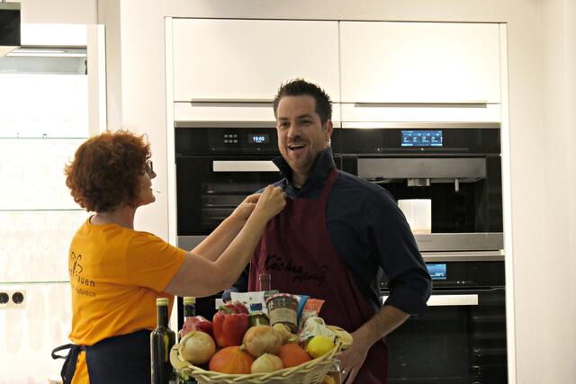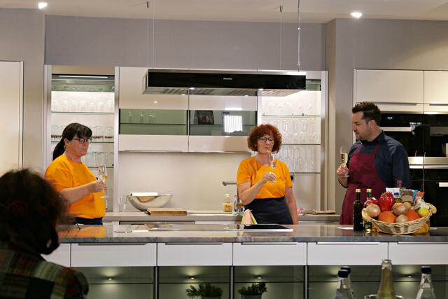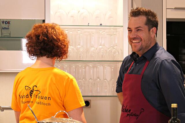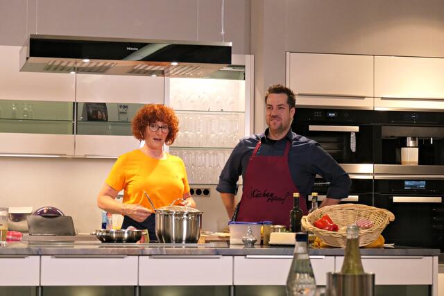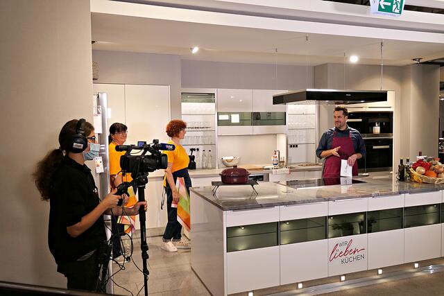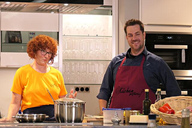 Haßloch/Speyer. Am 7. Oktober fand ein ganz besonders kulinarisches Event statt. Ab 19.00 Uhr machte sich bei StrohmeierGilb die Küchenwelt in Speyer für eine Aufzeichnung zum „Küchengeflüster mit den LandFrauen“ bereit. Das Team vom Offenen Kanal Weinstraße mit Markus Merkler als „Chefkoch“ hatte bereits Vorarbeit geleistet, den Tisch für die „geladenen“ Gäste mit Brezeln, Wasser und später auch Sekt gedeckt. Da wegen Corona die Anzahl der Zuschauer begrenzt war, kamen sechs LandFrauen aus Haßloch, um ihre beiden Köchinnen Andrea Jung und Tanja Orth zu unterstützen, sei es mit ihrer Anwesenheit oder mit Beifall.