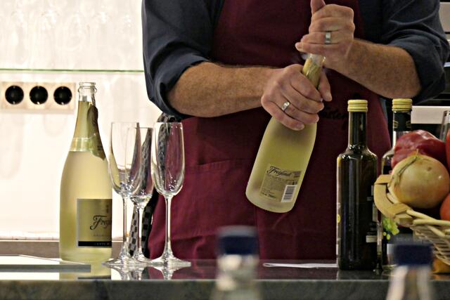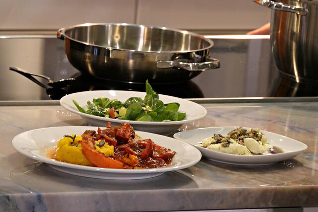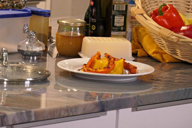 Heutiges Menü sollte ungarisches Gulasch mit Kürbispastinakenstampf, dazu Feldsalat mit Traubenbelag und zum Abschluss Vanilleeis mit Kürbiskernöl sein. Zwei leckere saisonale Hokkaidos schnitt man in Stücke und im Steintopf lag das Gulasch vom Metzger des Vertrauens, das gut gewürzt und in den Backofen geschoben wurde. Mittels selbst hergestellter Gemüsebrühe und den gekochten Hokkaidostückchen pürierte man alles. Während Merkler die Aufgabe des Feldsalatputzens zugeteilt bekam, weil man da so schön entspannen könne, wurden die Trauben geschnitten und das Dressing vorbereitet mit lauter leckeren Zutaten wie Kürbiskernöl, Gemüsebrühe, Senf, Honig, Salz und selbstgemachter Marmelade. Die Kürbiskerne mussten auch noch geröstet werden. Mit einem Blick auf die Uhr wollte man sicher gehen, dass man auch noch den Nachtisch unterbringen könne, nämlich das leckere Vanilleeis mit Kürbiskernöl und Kürbikernkrokant drüber.