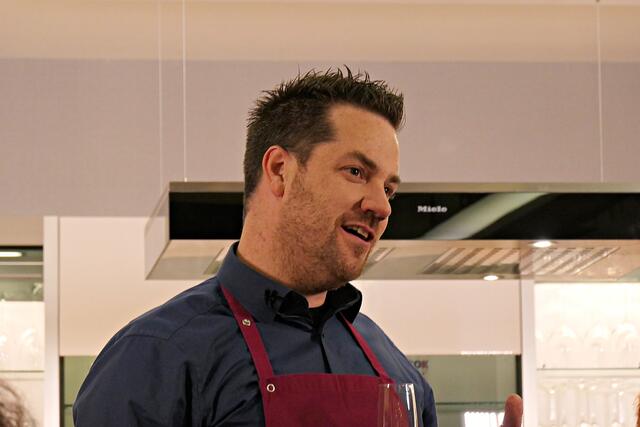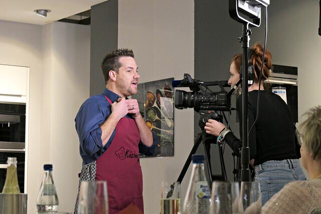 Es kam Leben in die Küche als das Filmteam alles auf- und einstellte. Bis alle mit Headsets versehen waren und die Mikrofonprobe stand verging nochmal eine halbe Stunde. Der „Drehtag im Küchenstudio“ war mein erstes Mal, kannte solche Sendungen nur aus dem Fernsehen. Die beiden Protagonistinnen hatten ein orangefarbenes bedrucktes T-Shirt an sowie eine blaue Küchenschürze, wobei auch Merkler eine Schürze umgebunden bekam. Zur Einstimmung auf einen unvergesslichen Abend wurde Sekt gereicht und das Publikum von Merkler als sehr sympathischen Moderator und Koch begrüßt. Andrea Jung meinte scherzend, ob der Abend mit Untertiteln gedreht würde, damit man das Pfälzisch besser verstehen könne. Alles lachte und ein kräftiger Applaus folgte, der das Signal zum Anfangen war. Es folgten allgemeine Hinweise in der Anmoderation, es wurden die Zutaten erklärt, was man kochen wolle und dass das Ganze natürlich zum Abschluss verzehrt werden würde. Die Hitze der Lampen und Scheinwerfer ließ den Moderator mehr als einmal zum Taschentuch greifen und dabei musste er aufpassen, dass das selbst aufgelegte Puder nicht verwischte. An Merkler ist ein Comedian verloren gegangen, denn als er sich nach Männern bei den Landfrauen umschaute und frage „Ei, wu sinn se dann?“ kam mir sofort unser Pfälzer Bub und Comedian Tim Poschmann in den Sinn. Es ging immer noch nicht los, erst entledigte sich die Kamerafrau ihrer unbequemen Schuhe, denn sie wusste, dass sie nun 2 Stunden an der Kamera stehen müsse.