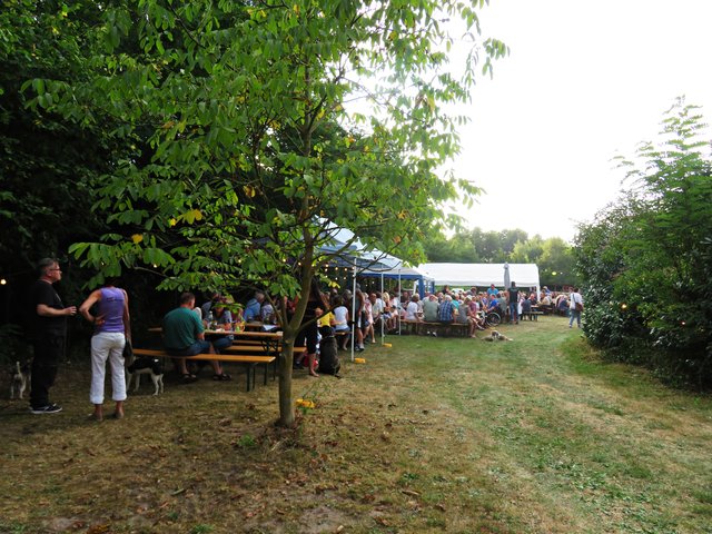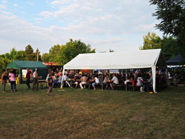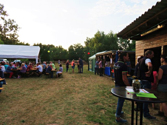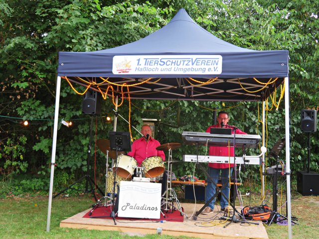Das „Duo Paladinos“ spielte live bekannte internationale Hits, so dass sogar das ein oder andere Pärchen zu tanzen begann. Die Besucher unterhielten sich angeregt, holten sich kühle Getränke und leckere Speisen an den Buden. Viele Gäste hatten als Begleitung ihre Vierbeiner dabei. Man merkte, wo man ist, denn überall standen fürsorglich für die Tiere Wassernäpfe an den Tischen. Es ging hoch her an diesem wundervollen warmen Abend und es wurde mit Fortschreiten der untergehenden Sonne immer voller auf dem Gelände. Ich sprach mit Nicole Fützenreiter über das Tierheim. Sie ließ mich wissen, dass es bereits seit 2006 das Lichterfest gibt, also genau so lange wie das Tierheim besteht. Sie erzählte, dass das Tierheim momentan 12 Katzen, einen Hund, drei Kaninchen, drei Schafe, zwei Zwergziegen und jede Menge Vögel beherbergt. Für die Vögel, Schafe und Zwergziegen gibt es Paten, die die Futterkosten übernehmen. Diese Tiere werden nicht vermittelt, aber alle anderen suchen ein neues Zuhause. Ebenfalls auf der Suche ist man nach neuen Paten, die sich an den Futterkosten beteiligen.