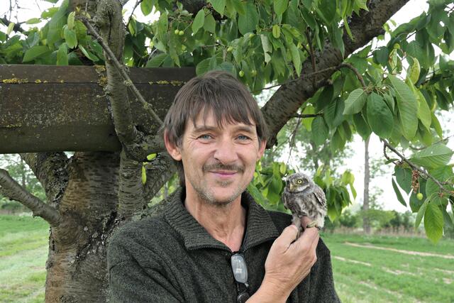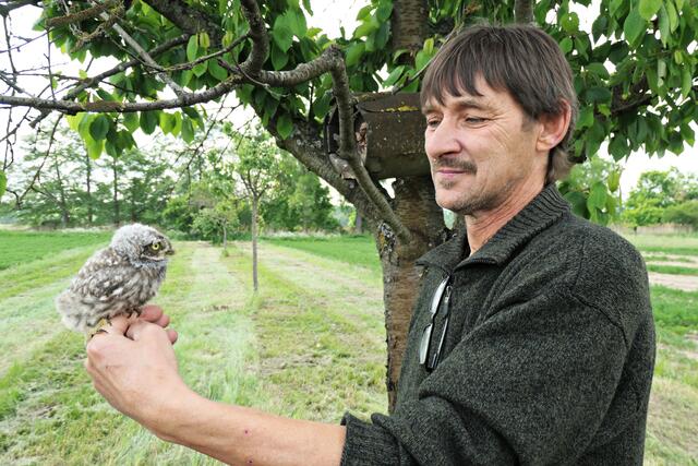 Hier im Kirschbaum gibt es also nun Nachwuchs von 5 Steinkäuzen und das bereits im fünften Jahr unter den wachen Augen von Przybylowicz, der jedes Jahr einen Bruterfolg vermelden kann. Bisher waren es immer drei bis vier Junge und dieses Jahr also gleich fünf an der Zahl. Ofer erzählte, dass es eher außergewöhnlich sei, wenn sechs bis sieben Junge zur Welt kommen, aber möglich sei es schon. Die Lebenserwartung dieser kleinsten Eule in der Rheinebene sei 8 bis 12 Jahre. Die Hoffnung ist, dass sie sie im nächsten Jahr als Eltern wiederfinden, denn leider kommen nur 50 % durch. Deshalb freut man sich über jeden Erfolg.