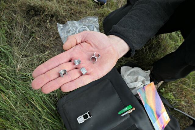 Der mit der ehrenamtlichen Beringung der Vogelwarte Radolfzell betraute Sven Ofer, von Berufs wegen Forstwirt und Natur- und Landschaftspfleger, bereitete seine durchnummerierten Ringe vor, damit man sogleich zur Tat schreiten konnte. Zweck der Beringung ist die Erforschung des Lebens der Steinkäuze, damit man weiß, wo sie leben und welche Lebensräume sie beziehen. Man kann dann entsprechend Schutzmaßnahmen ergreifen. Der Eingriff dauert insgesamt ca. 10 Minuten. Die Daten werden in eine Liste eingetragen und an die Vogelwarte Radolfzell gemeldet. Er erzählte, dass es 120 Röhren gibt, die er von Mitte Mai bis Mitte Juni betreut. Zurzeit gibt es ca. 20 Brutpaare.