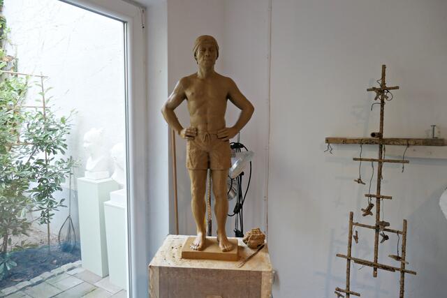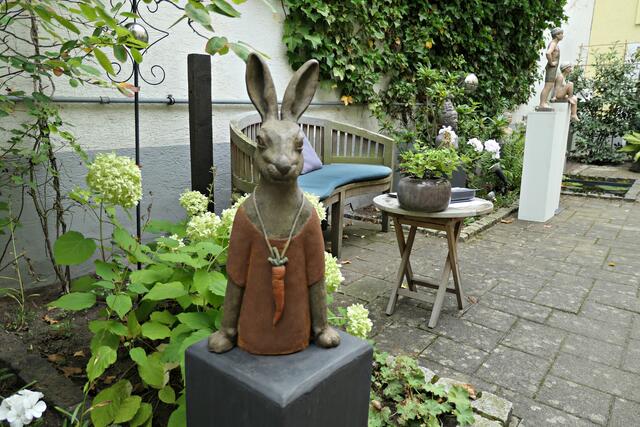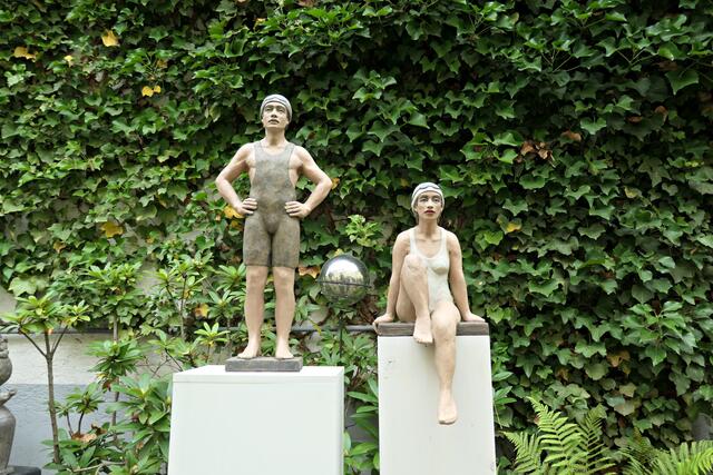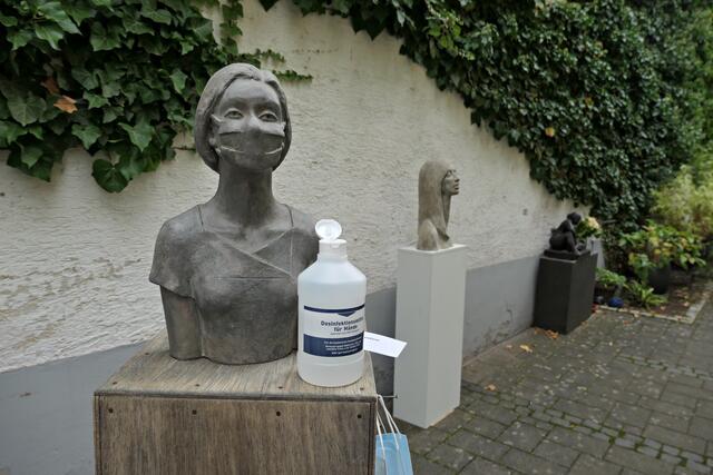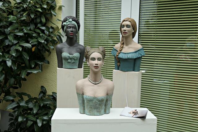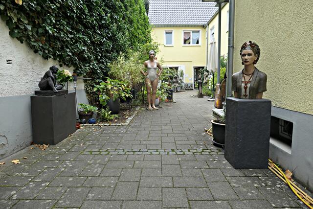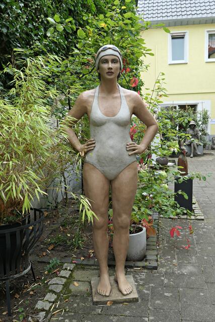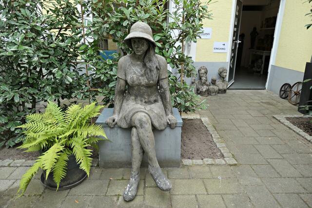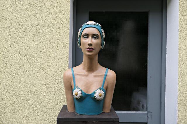 In der brachliegenden Coronazeit hatte sie eine zeitgerechte 40 cm große Büste mit Mundschutz namens „Hygieia“ kreiert, die gleich am Eingangsbereich neben Desinfektionsmittel zeigte, was hier gewünscht wurde. In den Figuren finden sich auch Familienmitglieder wieder. Alle Skulpturen weisen akribische Feinstarbeit auf; an jedes Detail wurde gedacht. Mich persönlich beeindruckte die Skulptur der mexikanischen Künstlerin Frida und die Badenixen, die wie echt wirkten. Jede Figur bemalt sie individuell, so dass jeder Sammler trotz limitierter Auflage ein Unikat erhält. Ja, es gibt bereits Sammler, die darauf erpicht sind, eine feine neue „Betongrazie“ in ihre Sammlung aufnehmen zu können.