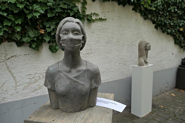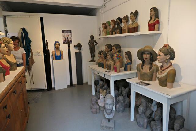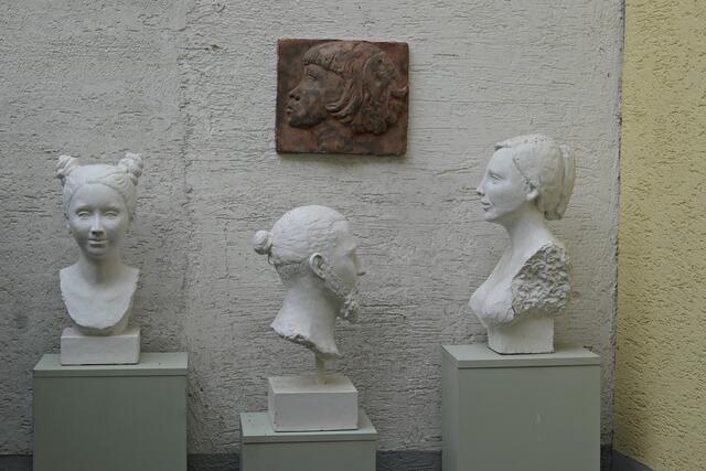 Im Gespräch mit Gabriele Köbler erfuhr ich, dass ihre Ausstellung mit Besichtigung ihres Ateliers sehr gut besucht war und ich gerade ein paar Minuten der Ruhe erwischt habe. Seit 2004 arbeitet sie als selbständige Künstlerin und Quereinsteigerin in Haßloch, davor besuchte sie die Kunstschule in Herxheim bei Landau. Sie arbeitete viel nach Modell und hat gemerkt, dass es zu ihr passt und ist dabei geblieben. Die Modelle sind verschieden groß, aber die meisten sind kleine stilisierte Kopfplastiken aus Feinbeton. Für eine lebensgroße Figur braucht sie ca. einen Monat bis zur Fertigstellung, aber das seien Unikate. Im Kulturviereck in Haßloch stehen auch Plastiken von ihr, die sich „Die vier Kulturbegleiter“ nennen. Sie hat mit 16 Jahren in einem Zeichenkurs ihr Interesse an der Kunst entdeckt und sich danach weiter und weiter entwickelt. Heute bereichert sie als Mitglied die Kunstgruppe „Pfälzische Sezession“ und ist Mitglied im BBK Mannheim. Im Jahre 2018 erhielt sie den Herrenhof-Kunstpreis. Wenn möglich, werden ihre lebensechten Skulpturen wieder in etlichen Ausstellungen, Galerien, Kunstvereinen und öffentlichen Räumen zu finden sein.