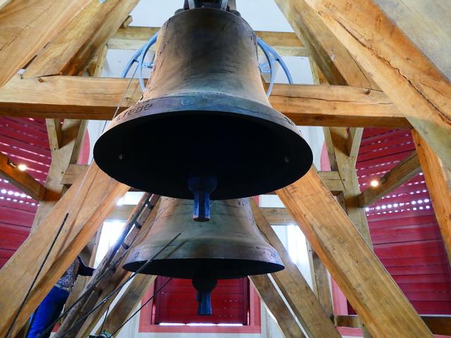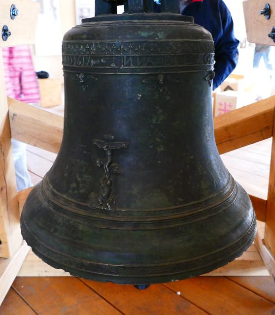 Schließlich gelangten wir durch den wunderbaren Kreuzgang der Kirche, wo noch eine zerbrochene Glocke des 1945 zerstörten Gotteshauses zu sehen war, zum Eingang des Glockenturms. Über eine schmale Wendeltreppe führten ca. 300 Stufen hinauf. Zuerst in die Glockenstube, wo vier Glocken aufgehängt sind. Drei der Glockengießerei A. Bachert, Karlsruhe, im Jahr 2008 hergestellt, und die 1496 gegossene "Beatrix-Glocke".