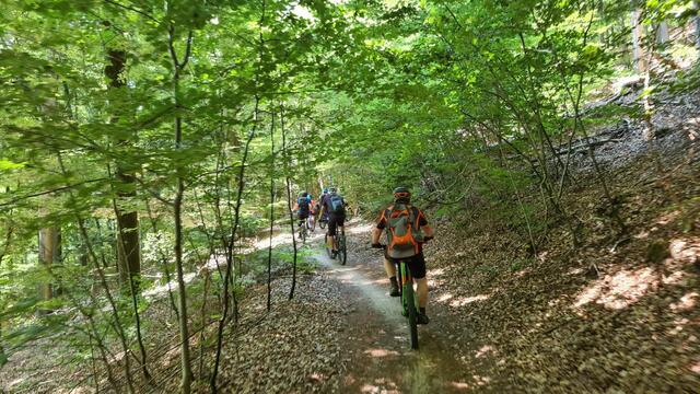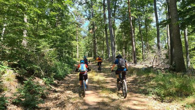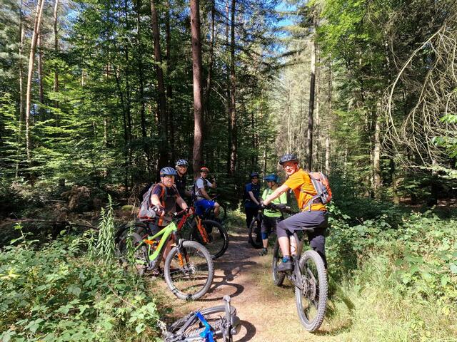 Das nächste Ziel war Mölschbach, das auf dem Pfad südlich der Strasse erreicht wurde. Kurz durch den Ort und wieder hoch zur Weltachs. Noch eine kleine Rast und schon waren wir auf den letzten Trails nach Hochspeyer. Der Wald war ziemlich leer und staubtrocken! Durch diverse Vortouren musste der Weg angepasst werden, da immer viel Schneebruch vom April manche Pfade und Wege versperrt.