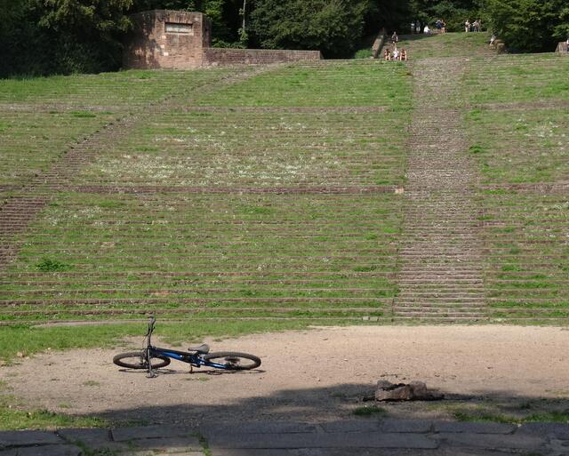 Schnell durch die überfüllte Stadt und den Philosophenweg hoch in Richtung Heiligenberg. Voll wars auch da! Vorbei an der "Thingstätte" das Nationalsozialismus (trotzdem sehenswert!) zum Heiligenberg und auf Schotter wieder hinab nach Dossenheim. Wobei die Pfade dort auch gut aussehen. Wir kommen wieder!