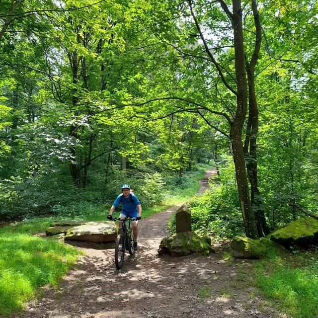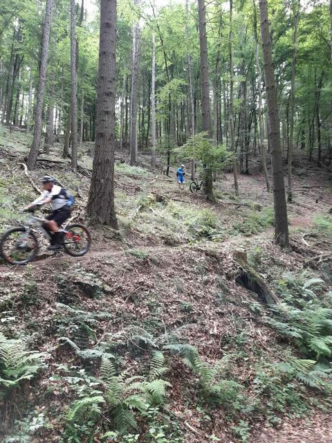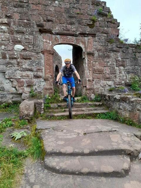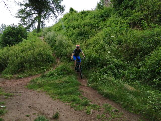 In den Sommerferien waren wir zu dritt auf Erkundungstour im Wasgau. Die Touren 14 und 15 des MTB Parks haben wir zusammengelegt. Unser Ideengeber und Guide hat uns auf vielen Trails durch die Südwestpfalz gelotst. Vom Start in Bundenthal ging es am Flugplatz vorbei in Richtung Wegelnburg, um aber vorher am Kuhnenkopf in einen Trail abzubiegen, der uns nach Nothweiler brachte. leider gab es hier nix zu essen oder trinken!?