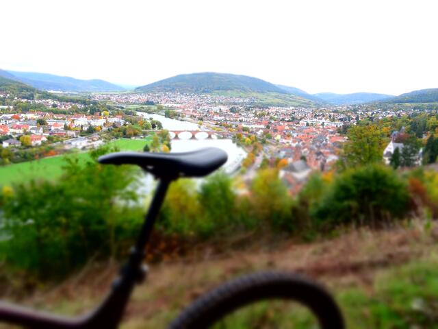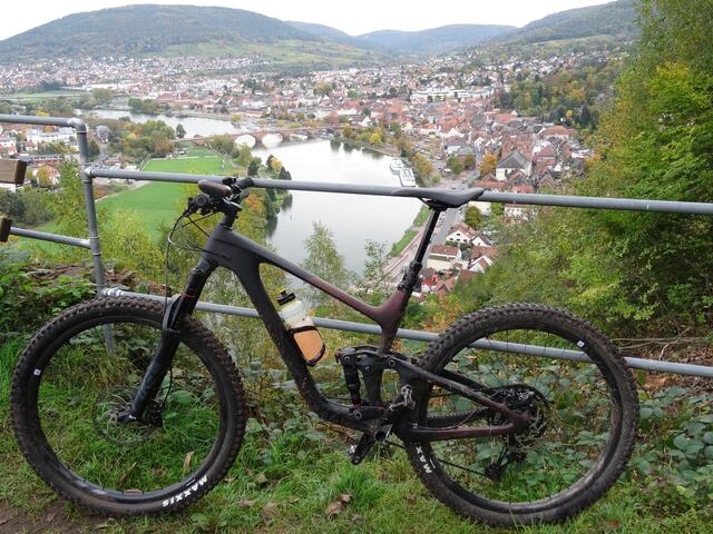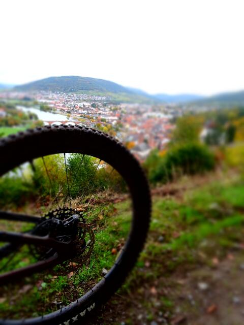 Nach kurzer ebener Strecke folgt der Akazientrail mit weiten Kehren bergab, schön zu fahren. Danach wieder, vorbei an einem Aussichtspunkt auf Miltenberg, echt steil und lang bergauf auf 452 Meter zum Ringwall. Es folgt der Keltentrail rumpelig bergab, aber auch wieder fahrbar, wenn die Skills sitzen ;-)