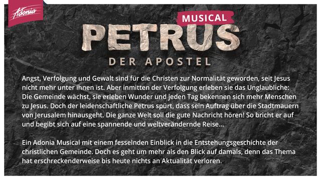 Angst, Verfolgung und Gewalt sind für die Christen zur Normalität geworden, seit Jesus nicht mehr unter ihnen ist. Aber inmitten der Verfolgung erleben sie das Unglaubliche: Die Gemeinde wächst, sie erleben Wunder und jeden Tag bekennen sich mehr Menschen zu Jesus. Doch der leidenschaftliche Petrus spürt, dass sein Auftrag über die Stadtmauern von Jerusalem hinausgeht. Die ganze Welt soll die gute Nachricht hören! So bricht er auf und begibt sich auf eine spannende und weltverändernde Reise… Ein Adonia Musical mit einem fesselnden Einblick in die Entstehungsgeschichte der christlichen Gemeinde. Doch es geht um mehr als den Blick auf damals, denn das Thema hat erschreckenderweise bis heute nichts an Aktualität verloren.