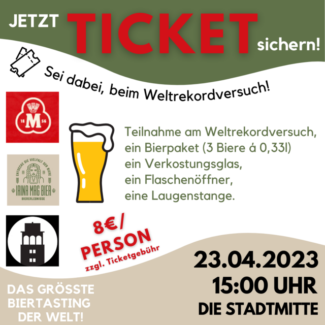 Doch alles steht und fällt mit der Anzahl der Teilnehmer. 1.400 Verkoster sind das Ziel des neuen Weltrekords, diese Anzahl an Personen passt in den idyllischen Innenhof und die Innenräume der Stadtmitte im denkmalgeschützten ehemaligen Postgebäude am Ettlinger-Tor-Platz. Tickets gibt es ab sofort online unter https://www.moninger.de/. Es wird eine Teilnahmegebühr von 8 € zzgl. Ticketgebühr erhoben. Darin enthalten sind 3 Biere (0,33l), ein Verkostungsglas, ein Flaschenöffner und eine Laugenstange. Der Einlass beginnt ab 13.30 Uhr, um 15.00 Uhr startet das gemeinsame, moderierte Tasting.