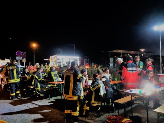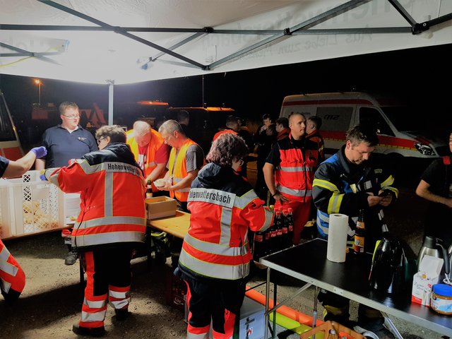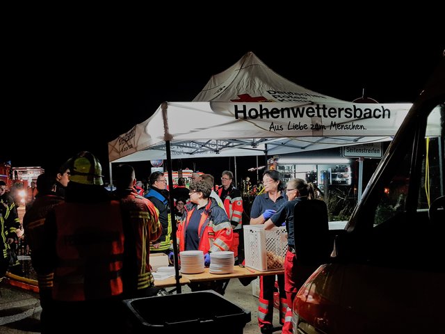 Beim Großeinsatz in Karlsruhe-Palmbach, der sich über mehrere Stunden in der Nacht hinzog, hat das DRK Hohenwettersbach unter anderem die Betreuung und Verpflegung der Einsatzkräfte an der Einsatzstelle übernommen.