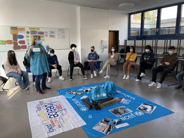 Am Freitag, dem 25. März wurde dieses Summe symbolisch an die Leiterin der UNICEF-AG Karlsruhe, Ursula Grass, überreicht. Diese erklärte anhand mitgebrachter Materialien anschaulisch den aufmerksam lauschenden KlassensprecherInnen den Weg der UNICEF-Hilfsgüter vom zentralen Warenlager in Kopenhagen bis hin zum UNICEF-Team in der Ukraine.