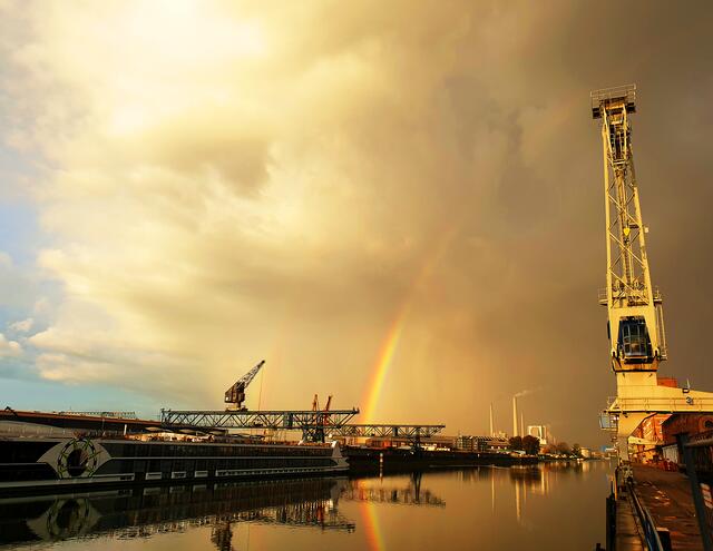 Regenbogen taucht ins Hafenbecken