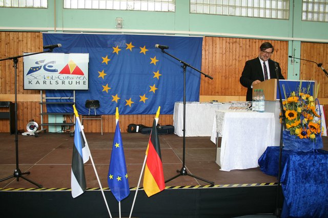 ESK-Direktor Daniel Gassner hieß die Gäste willkommen. „Es ist ein Jubiläumstag für die Europäische Schule Karlsruhe, ihr seid der 50. Abiturjahrgang“, sagte der Schulleiter und verwies darauf, dass seit 50 Jahren an der Schule 2782 Diplome des Europäischen Abiturs verliehen wurden. „In der ESK lernt ihr schon miteinander in Europa statt nur etwas übereinander zu lernen.“ Und weiter: „Keine Generation vor euch hatte so erfreuliche Gelegenheiten, sagen zu können: Wir sind Europa! Und ihr erlebt tatsächlich ‚mehr Europa‘ als alle Generationen vor euch.“ Daniel Gassner betonte: „Wir versammeln uns im Namen Europas für etwas – für Frieden und Freiheit, für Demokratie und Rechtstaatlichkeit, für Gleichheit, für Menschenrechte, für Solidarität. All diese europäischen Werte sind ein Versprechen, aber sie sind auch niedergelegt in Verträgen und garantiert in Gesetzen. Unsere europäischen Werte sind verbindlich, und sie verbinden. Liebe Abiturientinnen und Abiturienten, als junge Generation von Europäern, ist es auch ihre Pflicht diese Werte weiter zu pflegen.“