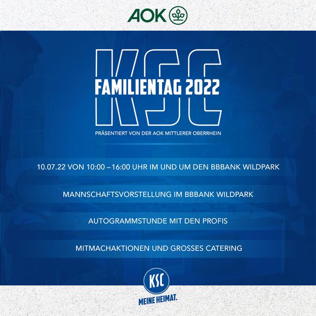 Mit verschiedenen (Mitmach-)Aktionen laden KSC-Partner, Abteilungen des KSC e.V. sowie Bereiche wie die KSC-Fußballschule oder "KSC tut gut" bis 16 Uhr zum Verweilen an ihrem Stand ein – von Torwandschießen über Fußball-Dart bis hin zur Schussgeschwindigkeitsmessung, einer Kinderrallye oder Kinderschminken ist am Familientag alles vertreten. Dabei gibt es natürlich auch viele kleine Gewinne bei den verschiedenen Ständen. Wer lieber nur zuschaut, genießt am KSC-Familientag einfach die Show der Ball- und Ballonkünstler im Wildparkstadion.
