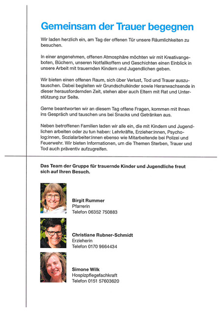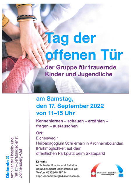 Die Mitarbeiterinnen der Gruppe für trauernde Kinder und Jugendliche des Ambulanten Hospizdienstes Donnersberg-Ost laden am Samstag, dem 17. September von 11 bis 15 Uhr zu einem Tag der offenen Tür ein.