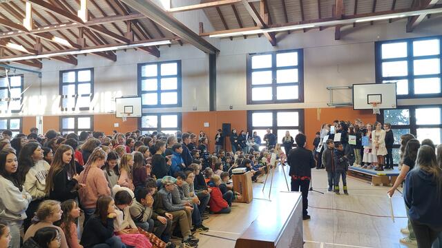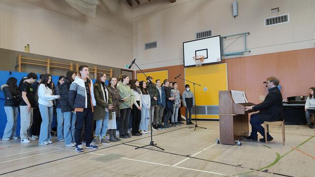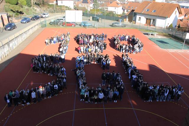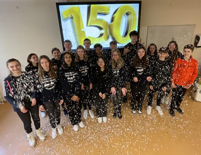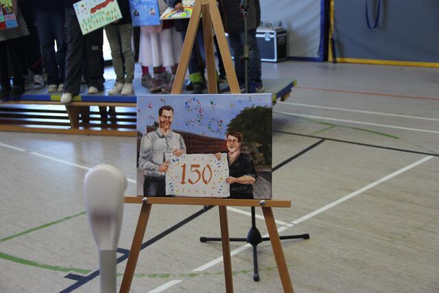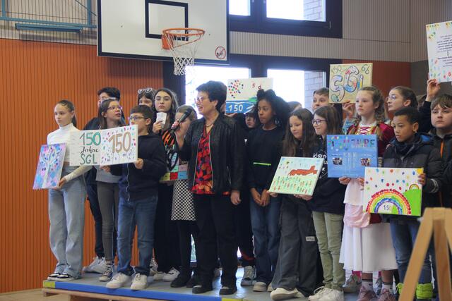 Die Auftaktveranstaltung zum Schuljubiläum, die von Lisa Krauß, Frank Dick, Marthe Lumma und Achim Wätzold sowie von der SV organisiert worden ist, begingen sowohl die Schülerinnen und Schüler in Landstuhl als auch in Wallhalben mit mehreren parallel stattfindenden Aktionen. Zur Einstimmung sangen die Musikklassen von Christoph Schuster den Song „Don’t stop believin’“ von der Popgruppe Journey. Dann formte die Schülerschaft auf den Sportplätzen in Landstuhl und Wallhalben jeweils den Schriftzug *150 SGL* bzw. das Jubiläumsjahr *150*. Außerdem wurde in jeder Klasse bzw. in jedem Kurs ein inszeniertes Klassenfoto mit Bezug zum Jubiläum gemacht und jede Klasse gestaltete gemeinsam eine Leinwand mit Motiven zum Jubiläum. Bei der Präsentation der künstlerisch gestalteten Plakate durch die Vertreter der einzelnen Klassen und Kurse gab es in der Sporthalle sehr schöne Ergebnisse der gemeinsamen Arbeit zu bestaunen. Die Vertreter der Klasse 5b, Philipp Bettinger und Marlin Schuck, sagte zum Beispiel zu dem bemerkenswerten Plakat seiner Klasse: „Wir haben festgestellt, dass wir zusammen mehr erreichen können als jeder für sich alleine. Darum haben wir uns überlegt, das auch auf die Leinwand zu schreiben, weil es für jede Klasse ein Ziel sein sollte, zusammenzuhalten und eine Gemeinschaft zu sein." Im Anschluss wurden die Klassenfotos aus Landstuhl und Wallhalben an beiden Orten auf einer großen Leinwand präsentiert.