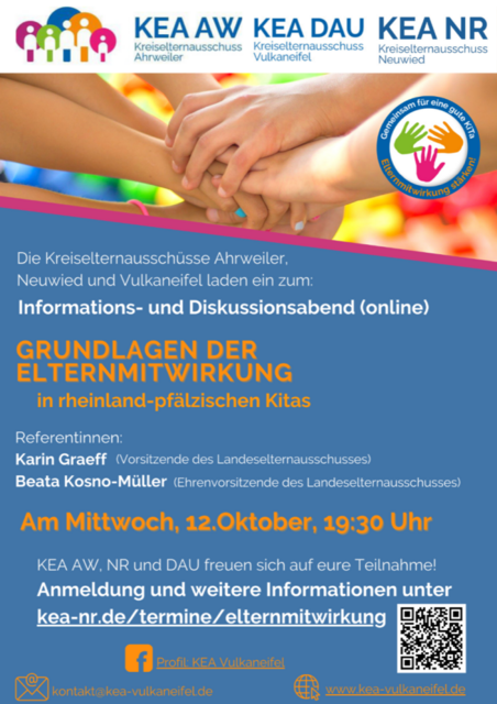 Am Mittwoch, 12. Oktober 2022, um 19:30 Uhr findet online ein Informations- und Diskussionsabend statt, zu dem die Kreiselternausschüsse Ahrweiler (KEA AW), Neuwied (KEA NR) und Vulkaneifel (KEA DAU) herzlich einladen.