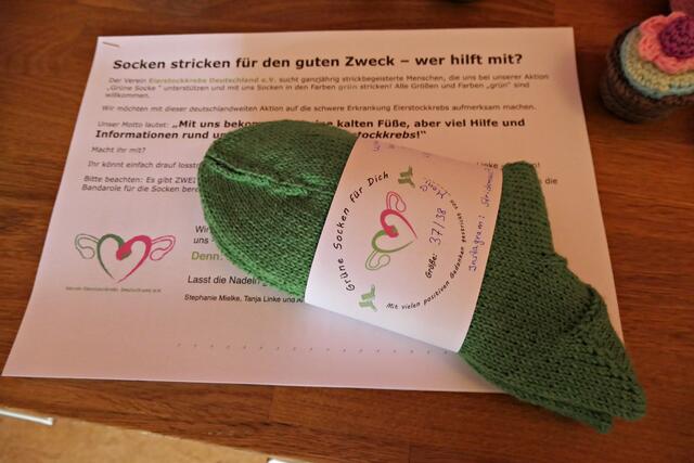 Moni: Ach ja, der Verein Eierstockkrebs Deutschland e. V. hat das publik gemacht. Das Motto lautet „Mit uns bekommt ihr keine kalten Füße, sondern viel Hilfe und Informationen rund um Eierstockkrebs!“ Strickerinnen können einfach drauf losstricken und die Sockenspende an den Verein schicken mit dem Stichwort „Grüne Socken“. Bei der „Grüne Socken Aktion“ sind alle Grüntöne, vornehmlich werden Größen 38-41 gesucht, jedoch auch alle anderen Größen. Man möchte mit dieser Aktion auf die schwere Erkrankung Eierstockkrebs aufmerksam machen und erkrankten Frauen deutschlandweit ein paar grüne Socken durch die Krankenhäuser bei der Chemotherapie oder stationären Aufenthalt zukommen lassen.