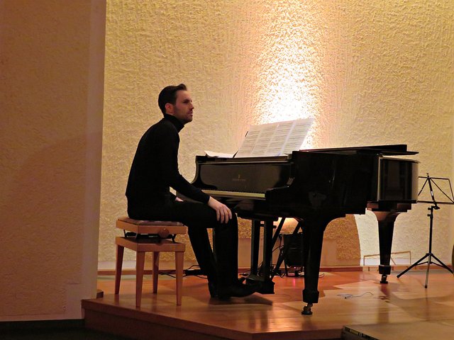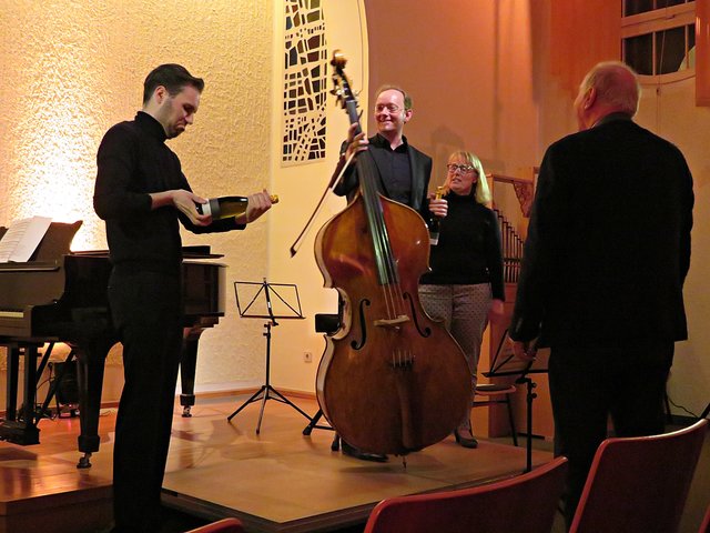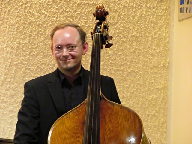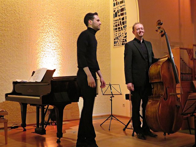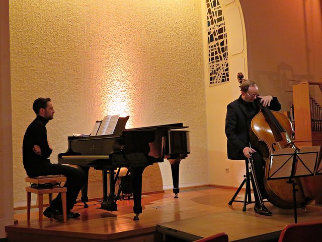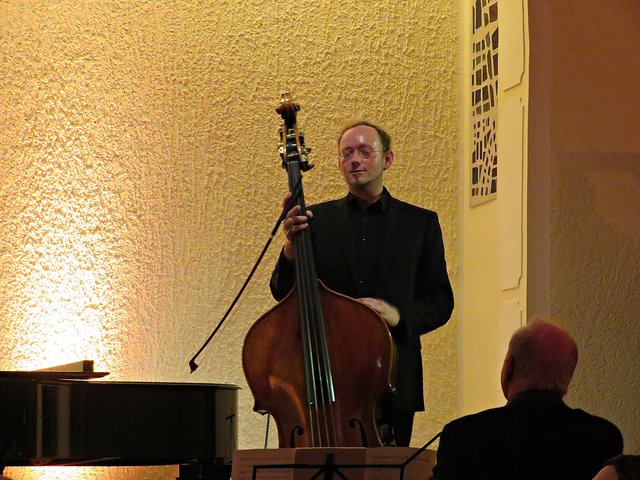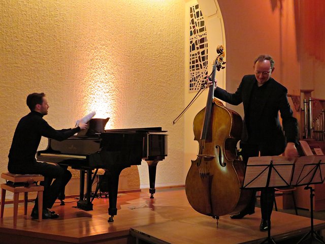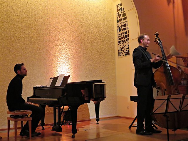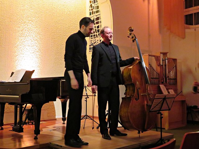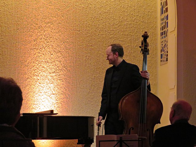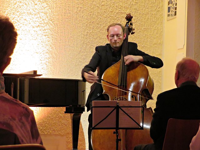 Nach einer Stunde großartiger Musik und Erläuterungen gab es eine kleine Erfrischungspause, um dann mit einem lyrischen „Konzertstück op. 24“ von Johann Geisel fortzufahren. Es war mucksmäuschenstill im Raum; man hätte eine Stecknadel fallen hören können. Dann folgten zwei Werke von Martin Brenne, einem Studienkollegen des Pianisten Jan-Paul Reinke. Brenne komponierte für sie das Duo „Déjà entendu pour contrebasse et piano“ und dann für Scharff „4 Kapitel für Kontrabass solo“ (Prolog, Walzer, Studie II und Epilog). Mit sichtlicher Freude beschrieb Scharff diese ganz aktuelle, zeitgenössische Musik, die ebenfalls mit großer Aufmerksamkeit gehört wurde. Das Publikum gab reichlich Applaus und würdigte so diese ungewohnten Werke und das Spiel der beiden Musiker.