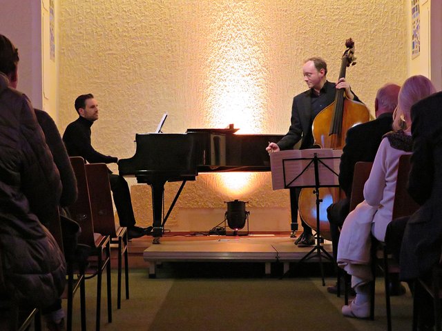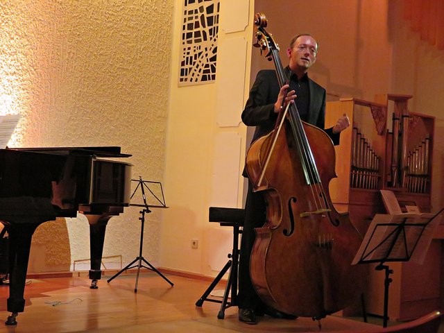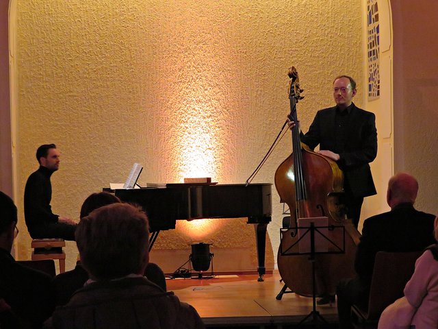 Alexis Scharff am Kontrabass spielte exzellent. Er ist ein versierter Orchestermusiker und mit seinem Freund und Duo Partner Jan-Paul Reinke am Flügel nicht nur in Mannheim, sondern überregional bekannt. Beide sind zum zweiten Mal in der Kultur-Kapelle und harmonieren blind miteinander. Man merkt, dass sich die Beiden schon lange kennen. An diesem Abend hatten sie sogar eine CD von diesen Stücken im Gepäck, die Scharff dann den Zuschauern auch wärmstens ans Herz legte.