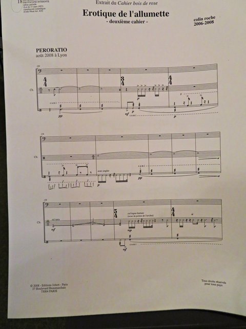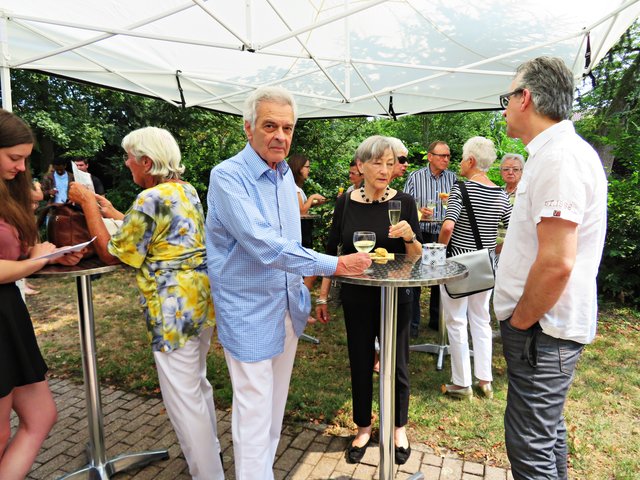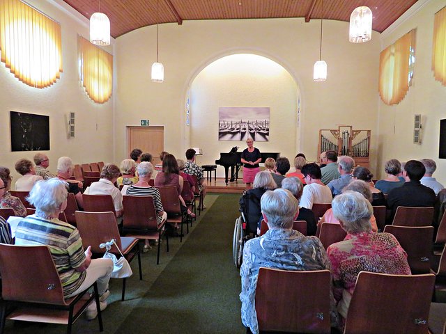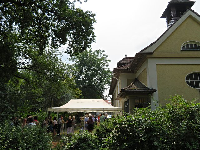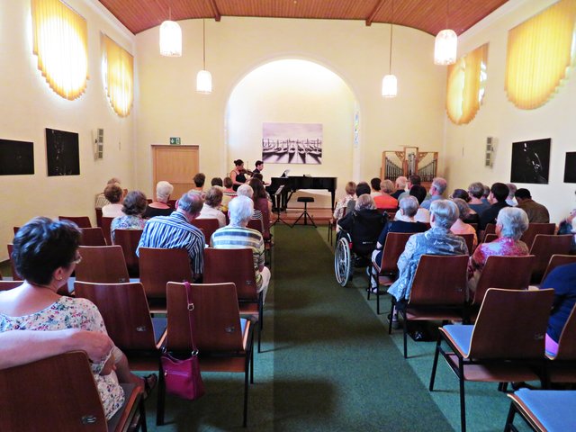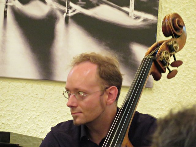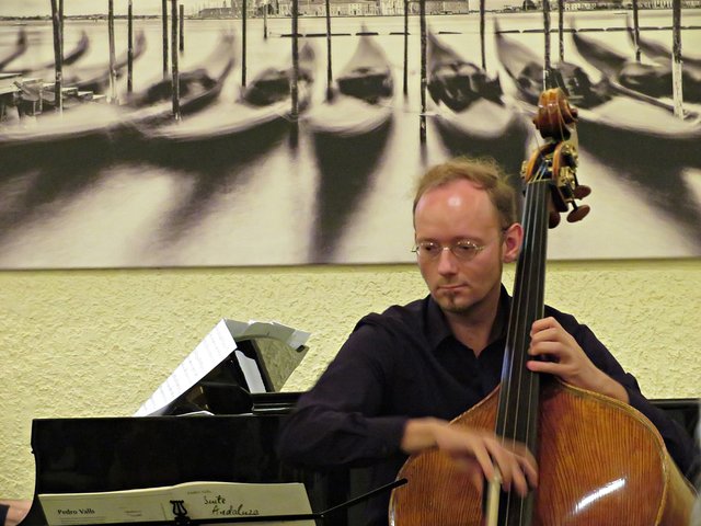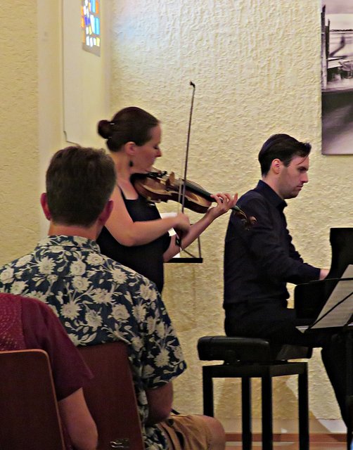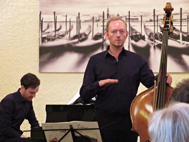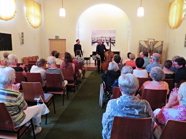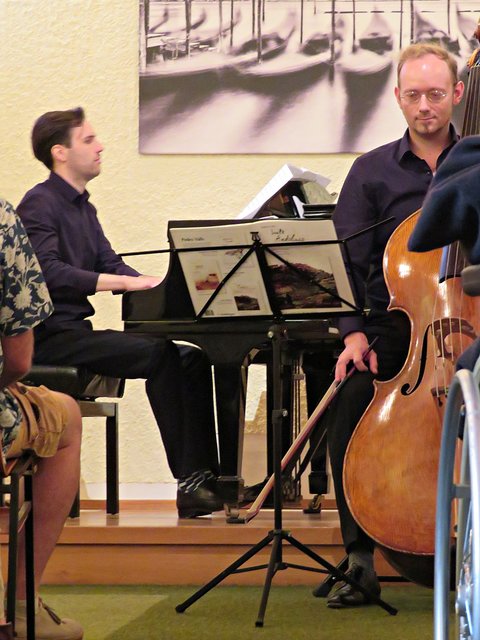 Es fanden sich 50 bis 60 Kunstinteressierte zu diesem lauschigen Spätvormittag ein. Vorstandsmitglied Monika Werra begrüßte die Gäste mit herzlichen Worten und merkte an, dass die Musiker Berufsmusiker seien und neben ihrer festen Stelle in Orchestern die Herausforderung weiter mit ihrem Instrument suchen, um mit Musik zu arbeiten. Das erste Stück wurde von der Geigerin Pia Grutschus und dem Pianisten Jan-Paul Reinke (er begleitete fast jedes Stück) eröffnet. Es waren die „Zigeunerweisen op. 20“ von Pablo de Sarasate Es folgte die „Suite Andaluza“ von Pedro Valls mit dem Kontrabassist des Kurpfälzischen Kammerorchesters Alexis Scharff, der sich als hervorragender Conférencier erwies. Man spürte förmlich, wie er in der Musik aufgeht und mit ihr verschmilzt. Mit seinen ganzen Gebärden und witzigen Einlagen brachte er das Publikum das ein oder andere Mal zum Lachen. Die „Meditation de Thais“ von Jules Massenet übernahm wieder die Künstlerin Grutschus mit der Violine. Bevor die Pause „eingeläutet“ wurde kam noch einmal der Bassist Scharff zu Wort und zum Spielen. Er probiert gerne Neues aus und davon konnten sich dann auch die Zuhörer überzeugen. Das Stück „Èrotique de l’allumette“ – zu Deutsch „Erotik des Streichholzes“ – war eine Uraufführung und von ihm solo dargeboten. Colin Roche ist Pianist und Komponist. Er ist aber ein Künstler, der sich auch der Literatur und Poesie widmet. Grundlagen seiner Kompositionen sind Alltagsgegenstände, wie zum Beispiel das Streichholz. Zu Beginn führt Scharff das „Streichholz“ am Kontrabass vor, was etwas gewöhnungsbedürftig aussieht und sich dann auch so anhört. Unglaublich, welche Töne so ein Bogen, in verschiedenen Richtungen geführt, hervorbringt. Scharff wirft nach wenigen Tönen bereits Notenblatt für Notenblatt auf den Boden. Einmal bleibt das Blatt länger liegen. Ich war so fasziniert, dass ich das erste Notenblatt nach Beendigung fotografiert habe. Also dieses Stück ist mir besonders in Erinnerung geblieben, weil sehr außergewöhnlich.