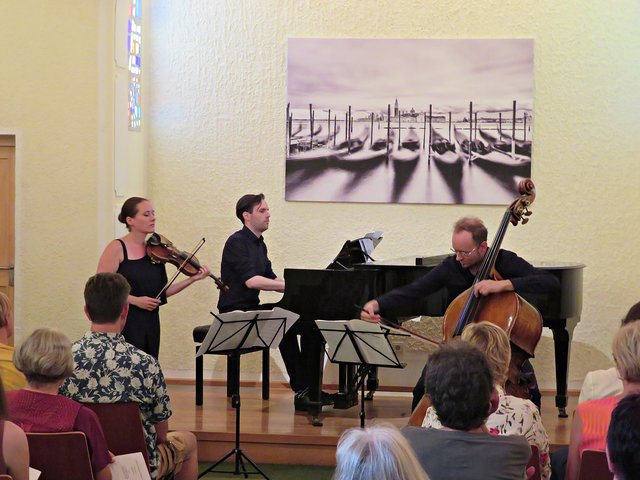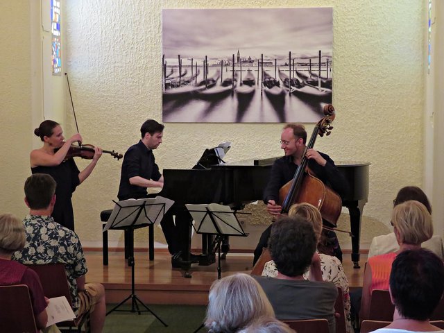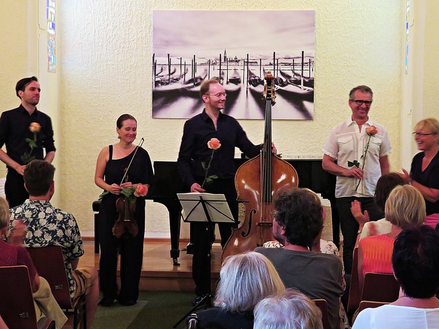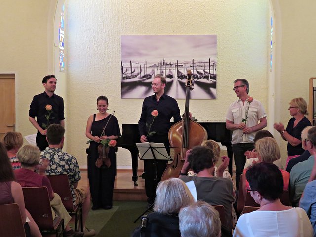 Nach der Pause wurden noch drei Stücke gespielt: „La Sonnambula“ von Giovanni Bottesini“, Präludium und Allegro“ von Fritz Kreisler und „Gran Duo Concertante“ ebenfalls von Giovanni Bottesini, das dann alle drei Akteure zum Abschluss mit ihren Instrumenten darboten. Kein Wunder, dass das Publikum durch den lautstarken Beifall die Drei zu einer Zugabe veranlassten. Die Zeit ist so schnell vergangen, dass man gerne noch länger gelauscht hätte. Zum Schluss bekam noch jeder Akteur von Frau Werra eine Rose überreicht und wurde mit dankenden Worten verabschiedet. Es war ein Feuerwerk der Symphonie! Falls Interesse am Kulturverein besteht, kann sich unter www.enpali.de informieren. (mel)