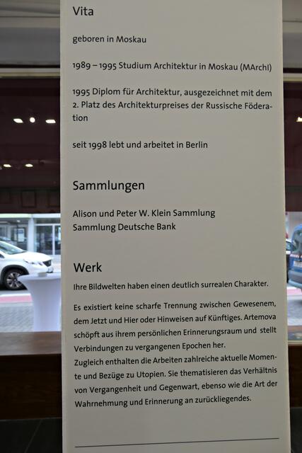 Sie wurde 1972 in Moskau geboren, studierte von 189 bis 1995 Architektur in Moskau (MArchl) und schloss das Studium mit einem Diplom ab. Sie erhielt eine Auszeichnung des Architekturpreises der russischen Föderation mit dem zweiten Platz. In Pakistan hatte sie auf der Kunstbiennale ausgestellt und Zeichnungs-Installationen in Form eines Panoramabildes gemacht. Seit 1988 lebt und arbeitet sie in Berlin als freie Künstlerin. Etliche Ausstellungen hatte sie bereits wie „Kein gestern, kein heute“ 2017 im Kunsthaus in Frankenthal, „ Landscapes of Tomorrow“ 2019 im Kyrgyz National Museum of Fine Arts, Bishkek, Kirgisistan, „Future Structures“ in 2019 in der janinebeangallery in Berlin, „Planet Art“ & „NABU-Welten“ in 2019 curated by Marianne Kapfer in Berlin und eine Gruppenausstellung mit dem Titel „BONUM ET MALUM“ in 2020. Nähere Informationen auf ihrer Homepage inna-artemova.de.