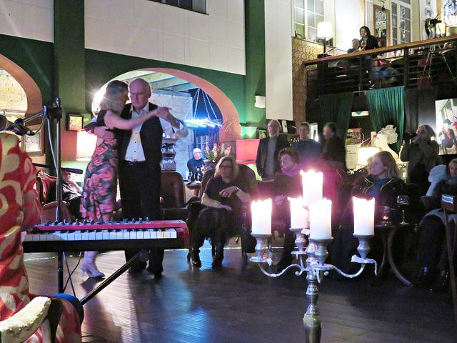 Die beiden musikalischen Halunken spielten etliches zwischen Bach, Beethoven, den Beatles und dem Blues. Als „Carmen“ als Tango dran kam, traten Horst Hofmann und Birgit Boge als eingespieltes Tanzteam auf die Tanzfläche und zogen alle Blicke auf sich. Hofmann ist Tanzlehrer für Tango und gerne und oft gesehener Gast im Cinema Paradiso mit seinen speziellen Tango-Abenden. „Carmen“ wurde von Geenen mit „Ganz Paris träumt von der Liebe“ synchron eingebaut. Danach kam noch eine Komposition von Arnold Schönberg aus dem Jahre 1920, die beide zusammen spielten. Zu dem Walzer „Alte Zeit“ aus Böhmens Wald und Flur bediente sich Vanecek wieder seiner Melodica. Das Lieblingslied von ihm sei jedoch „Die Moldau“, allerdings in einer etwas moderneren Version. Mit dem „Leben des Brian“ ging es dann in eine wohlverdiente Pause.