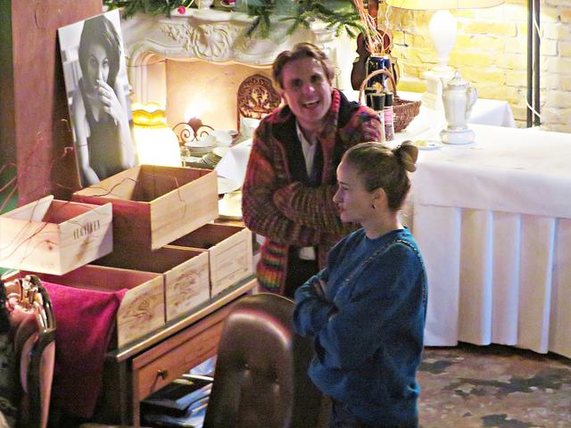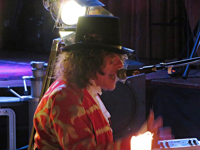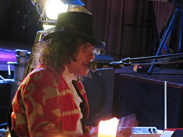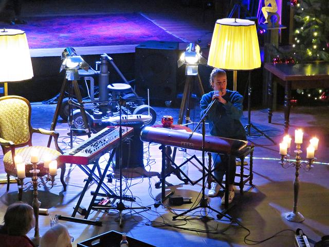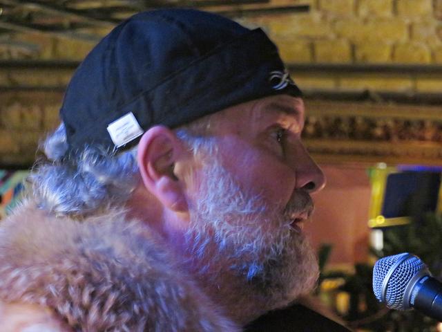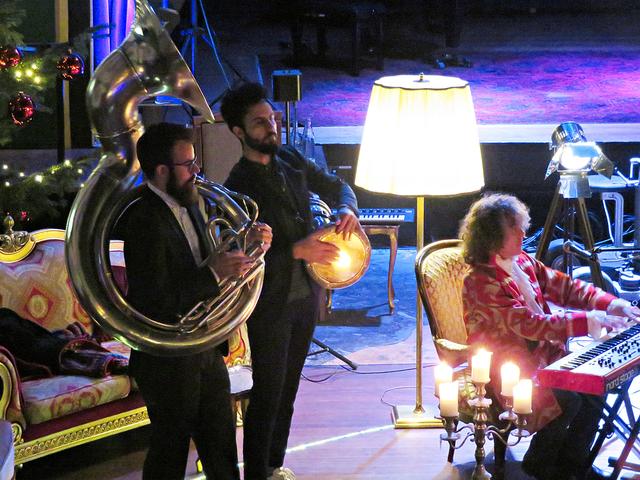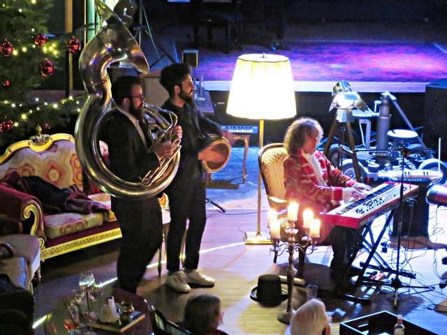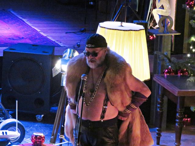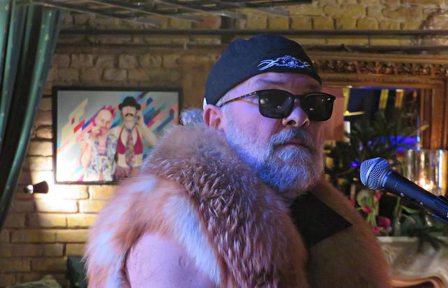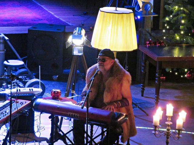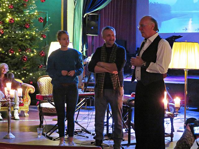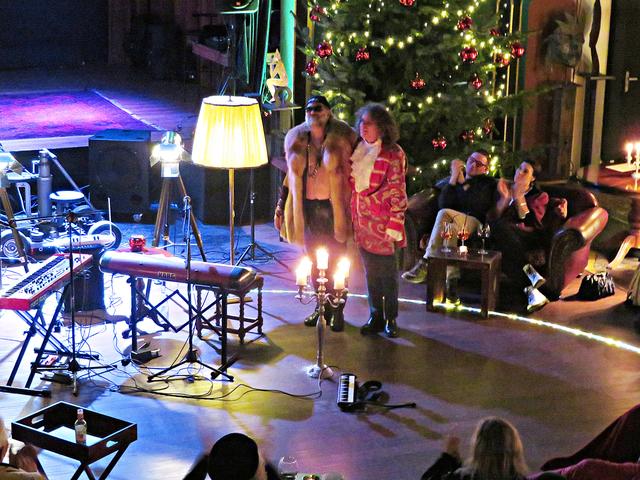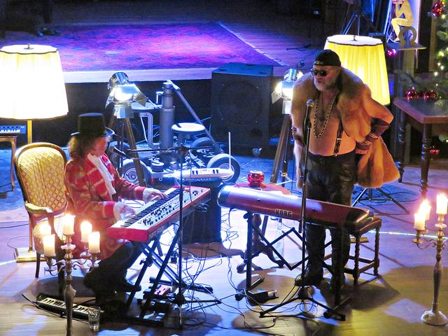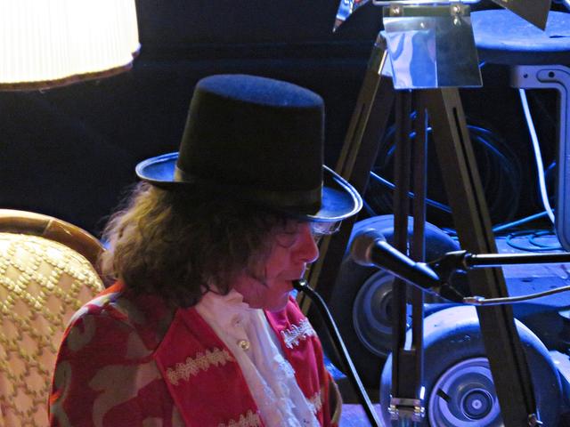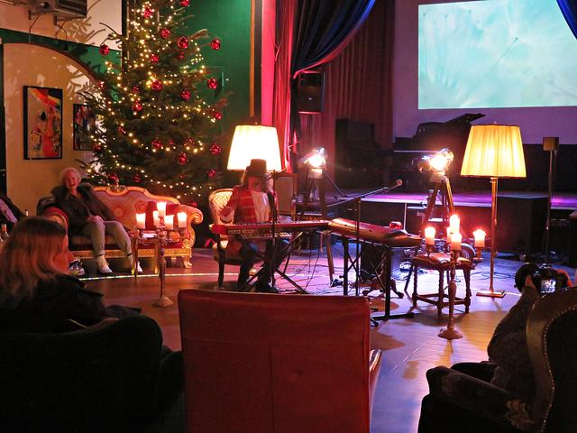 Roland Vanecek betrat mit einer Melodica umgehängt als Erster den Raum, bahnte sich seinen Weg durch die Gäste hin zu seinem Platz in der Raummitte mit Keyboard. Er verstand es auf Anhieb, mit seiner etwas nasalen kräftigen Stimme alle Facetten seines Könnens zu präsentieren. Und sogar den österreichischen Schmäh beherrschte er in seinem Lied „S’ist Winterzeit in Wien“. Er war eine auffällige Erscheinung, die alle Blicke auf sich zog mit seinem zylinderähnlichen Hut, den langen gelockten Haaren und dem rot-beigen Sakko, das ihm auf den Leib geschneidert schien. Er kündigte seinen Musikerkollegen an, der sich wohl verspätet habe, da er eine weite Reise von einer entfernten Insel hinter sich habe. Geschrieben hätte Vanecek per Flaschenpost und man wüsste nicht, wann sie angekommen sei. Von seinen Freunden würde Franz van de Geenen nur Baloo genannt, wie der Dschungelbuchbär, groß und kräftig. Nachdem Vanecek noch auf seinen Kollegen warten musste, gab er in der Manie und Stimmfarbe von Louis Armstrong ein von dem Schauspieler Axel Prahl geschriebenes Stück zum Besten.