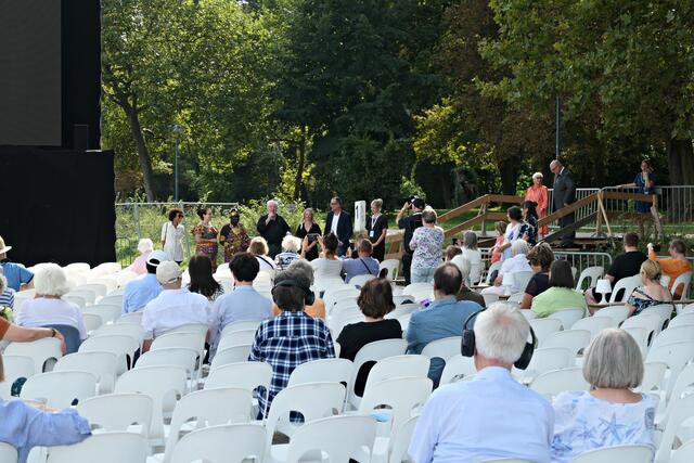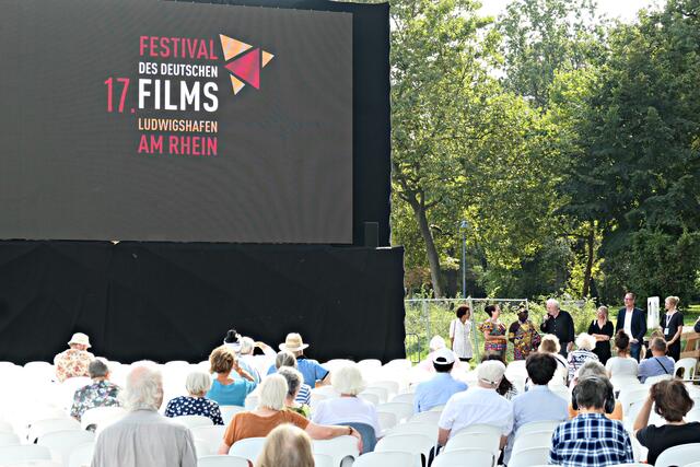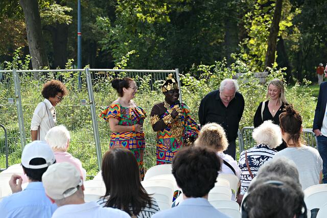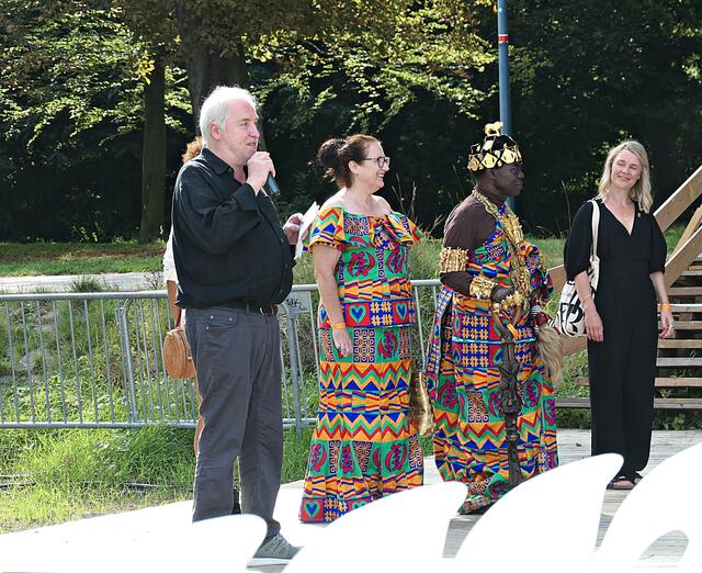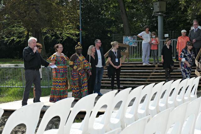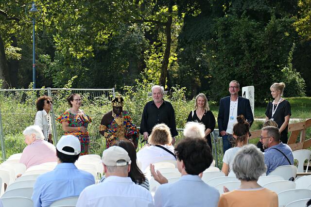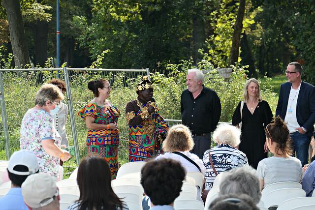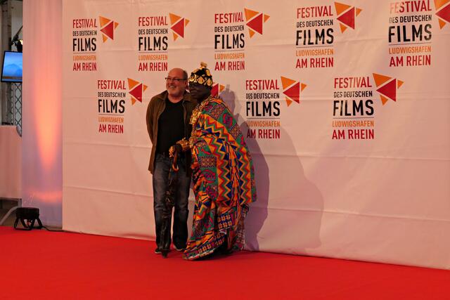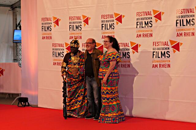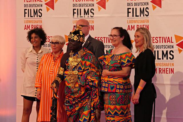 Bereits um 15.00 Uhr lief der Film im Freiluftkino auf der Parkinsel. Was ich bei meiner Reservierung in der dritten Reihe nicht ahnen konnte war, dass mich die Sonne voll erwischte. Da hatte es die angereiste Familie und Filmcrew wesentlich besser im Schatten der Bäume, obwohl …… König Bansah und seine Frau kamen in ihrem königlichen Gewand, das bestimmt auch nicht viel Luft an den Körper ließ. Vor die Kameras und Handys traten die Regisseurin Agnes Lisa Wegner, König Céphas Bansah, Katharina Bansah, Gabriele Bansah und von der Produktion Christoph Holthof, Daniel Reich & Luna Selle. Beim kurzen Plausch mit Filmfestival-Intendant Kötz vor Filmbeginn meinte Bansah „Ludwigshafen ist die schönste Stadt und nicht mit Ghana zu vergleichen“.