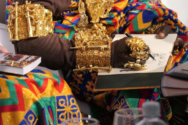 Auf die Frage aus dem Publikum, ob in Ghana eine Demokratie herrsche, antwortete Bansah, dass es seit 30 Jahren eine stabile Demokratie gebe. Und er erzählte wie er zu der Krönung zum König kam. Sein Vater hatte 12 Frauen und er habe 72 Geschwister, ja, sein Vater sei fleißig gewesen. Als sein Vater starb kam einer aus Deutschland auf den Thron, nämlich er. Er hatte die Möglichkeit an so ziemlich alles zu kommen, was sein Volk in Ghana medizinisch brauchte. So hatte man bisher für Operationen und Bauchweh immer nur Aspirin verabreicht. Er bekam von einer hilfsbereiten Ärztin auch andere Mittel für die Behandlung von den Würmern, die sich am Körper und in den Augen des Volkes breit machten. Als es um die Wahl zum neuen König ging, war man der Meinung, der König müsse dick sein, er jedoch war in jungen Jahren eher dünn. Wenn man König werden will, kommt man zuerst in Quarantäne in eine Hütte. Es folge dann eine eher blutige Zeremonie mit Schnitten in Arm, Rücken, Brust und Knie, die es zu bestehen gilt.