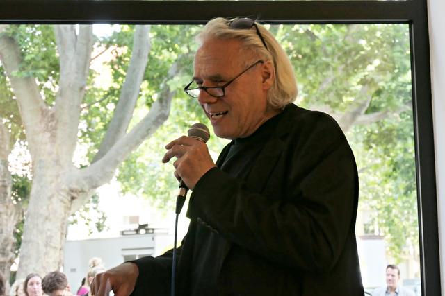 Als nächstes ergriff der Mannheimer Künstler Wolfgang Sautermeister das Mikrofon und gab einen Einblick in das Leben des großen Griechen Adonis Malamos, dass er viel gereist sei und von seinen Reisen immer hervorragende Fotos mitgebracht habe. Nun sei er in Ludwigshafen sesshaft geworden und liebe es. Seit 2002 sei er Besitzer des Café Prag in Mannheim, das inzwischen legendäre Kaffeehaus mit Kultstatus, in dem schon internationale Jazzgrößen und Filmschauspieler Halt gemacht haben, ein Ort, an dem neben Ausstellungen und Jazzkonzerten auch Lesungen stattfinden. Adonis Malamos ist aber auch Fotograf mit Leib und Seele. Er hat unter anderem einen Bildband über die schönsten Cafés Europas herausgebracht, so dass man am liebsten alle Cafés nacheinander abfahren möchte. Anschließend trug er sein Gedicht mit dem Titel „Eine Nacht in Schwarz-Weiß“ für ihn vor.