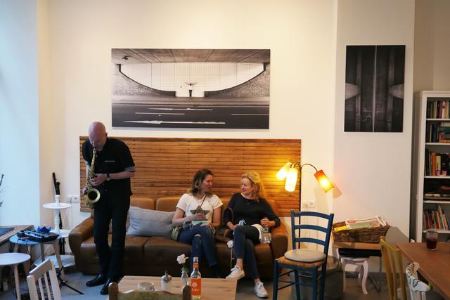 Danach durften die Besucher eine Runde laufen, nämlich mit Abstand einmal durch das Café, damit sich jeder die Fotografien ansehen konnte. Unter den Besuchern entdeckte ich auch die Künstlerinnen Beatrice D’Angelo (Chefin Cinema Paradiso & Arte) und Tati Fedorkowa (Modedesignerin), die sich angeregt mit dem Saxophonisten unterhielten und die Ausstellung genossen. Auch der Künstler und Fotograf Klaus Hecke, Stammkunde im Café Prag und mit Adonis in Freundschaft verbunden, war hier. Auch er hat ein Buch über Ludwigshafen mit viel Liebe, Lust und Leidenschaft mit dem schlichten Titel „LUD-WIG-SHA-FEN“ außergewöhnlich gestaltet ( www.buecher.llux.de ). Und dann entdeckte in noch Maike Müller aus Mutterstadt, ebenfalls Fotografin und an jeglicher Art Kunst interessiert. Adonis Malamos sucht für seine Fotografien besondere Motive und Momente, die fast wie Grafiken wirken, nur in Schwarz-Weiß, nur das Wesentliche festgehalten. Die Aufnahmen wurden zwischen 2015 und 2020 von ihm gemacht.