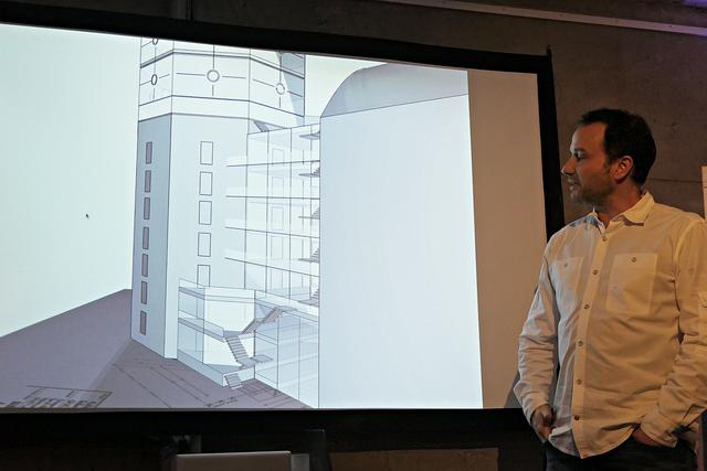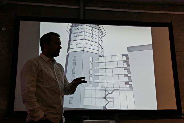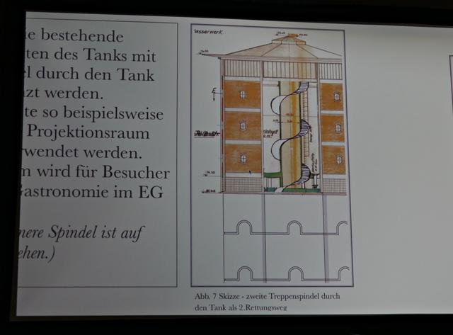 Man könnte laut Alberts eingereichter Bauvoranfrage im Wassertank mehrere Ebenen einziehen, was 700 qm zusätzlich böte. Auch im Bunkerteil wurden Wandöffnungen im neuen Zukunfts-Konzept eingeplant. Diese ist jedoch noch nicht im Detail ausgearbeitet und lässt sich auf den Bedarf anpassen. Die Zusammenarbeit mit dem Bauamt und Denkmalschutz hat, so Herr Albert, gut geklappt. Man habe gut zusammengearbeitet und sich auch geeinigt, dass bezüglich des Denkmalschutzes auch jeweils jede zweite Fassadenseite im Original erhalten bleibt. Mit vier Meter Deckenhöhe können sich nach einem Umbau sehr attraktive Räume im Wassertank ergeben.