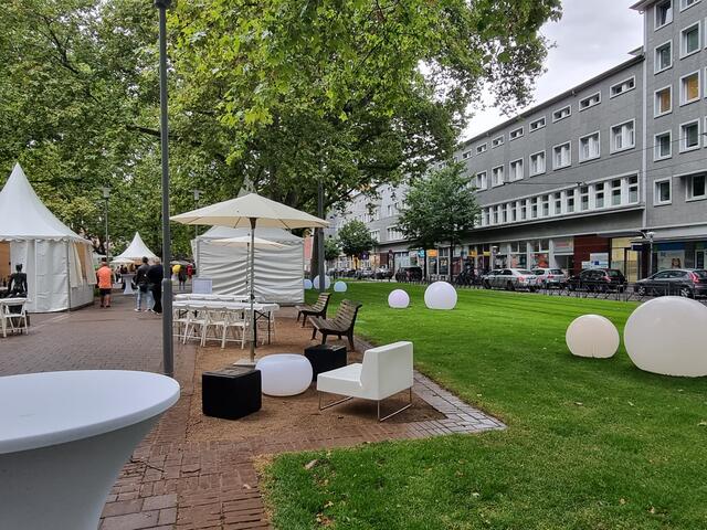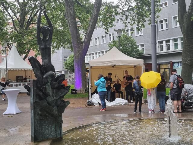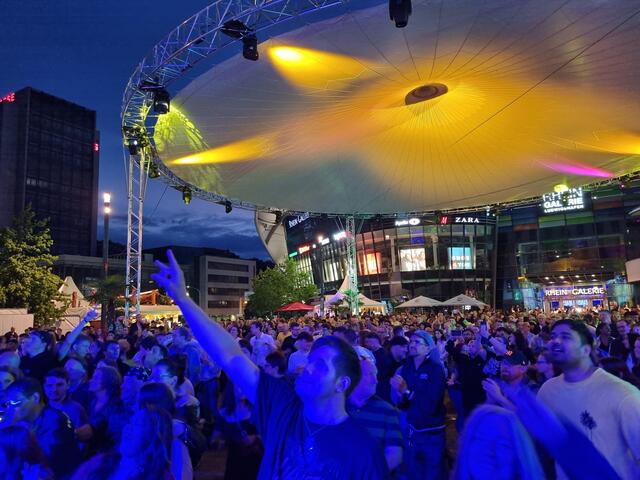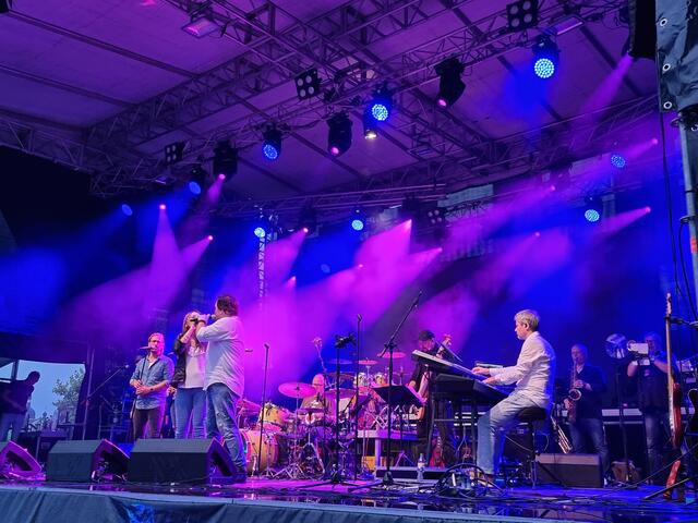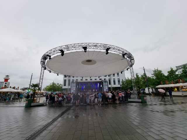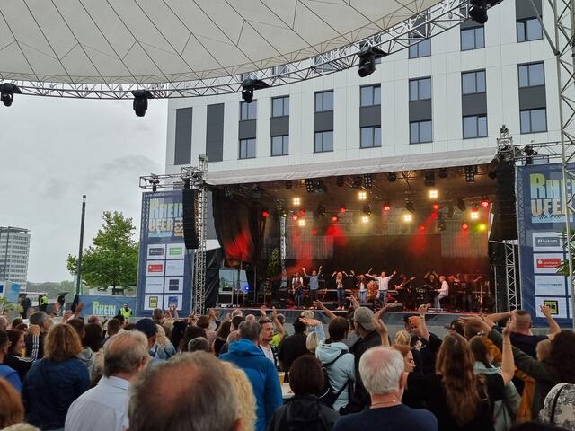 Ludwigshafen. Das Rheinuferfest Ludwigshafen 2022 ist gestartet. Gab es am Freitag, 24. Juni 2022, zu Beginn des Musikprogramms mit Brass Maschine noch heftigen Regen, dem einige hundert Menschen unter dem Magic Sky trotzten, hörte es pünktlich zu Beginn der Auftritts von Grand Malör auf. Der Platz war gut gefüllt und die Lokalmatadoren verbreiteten wie immer beste Laune.