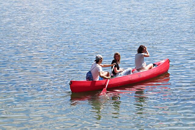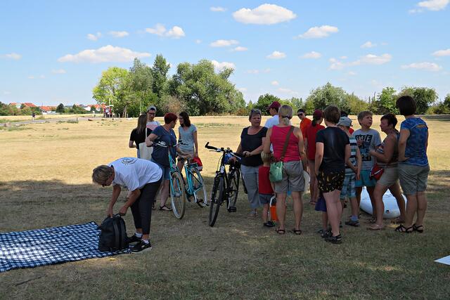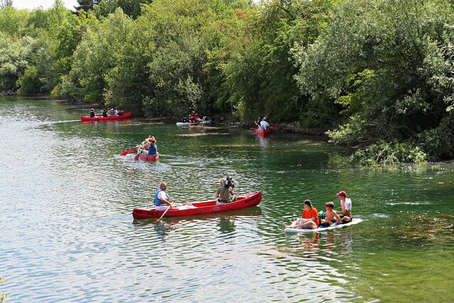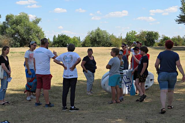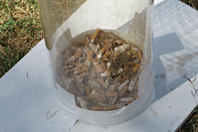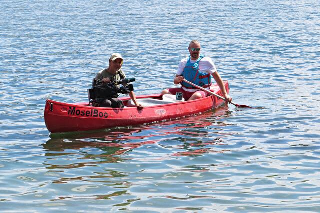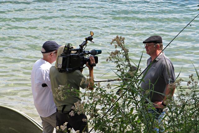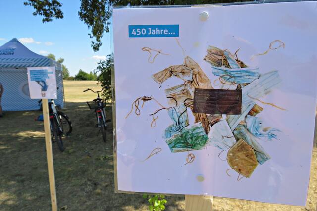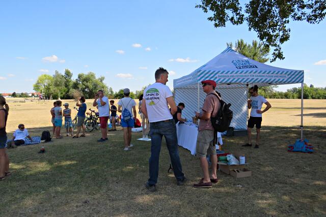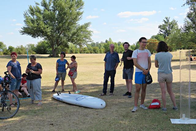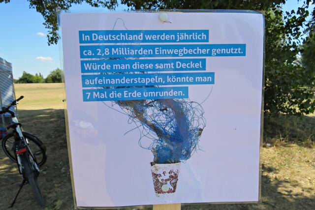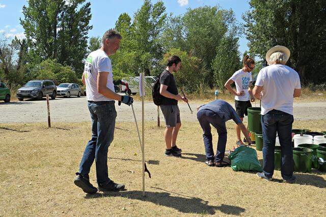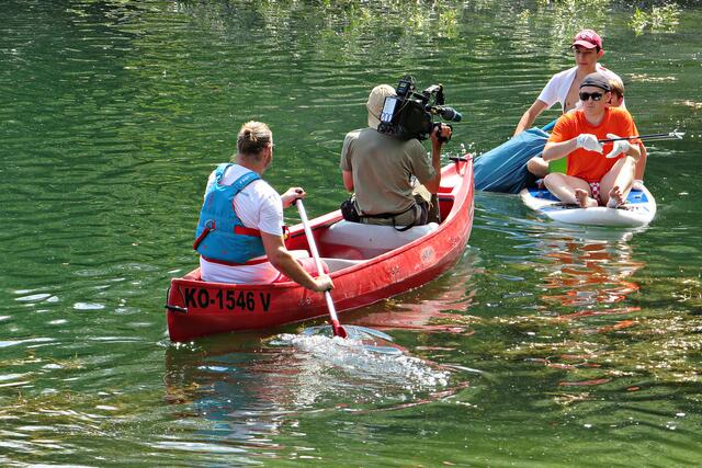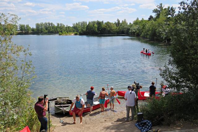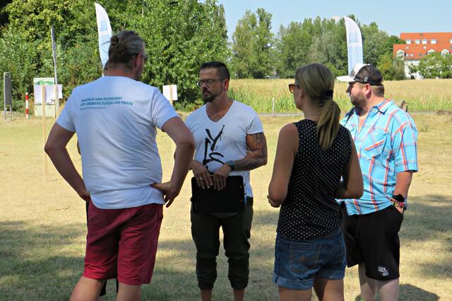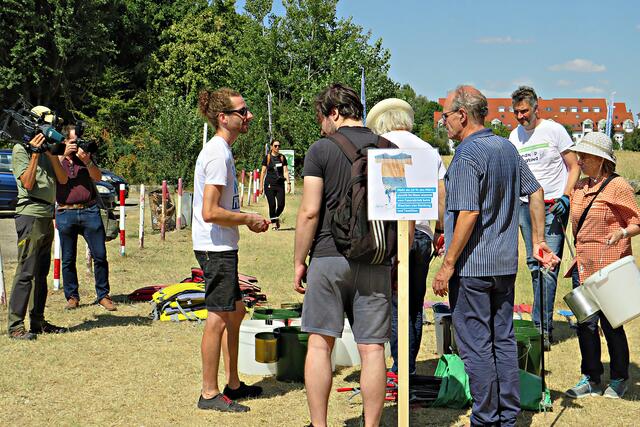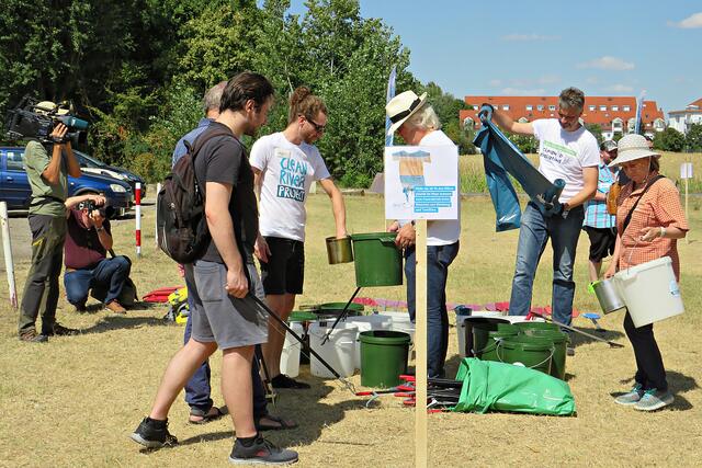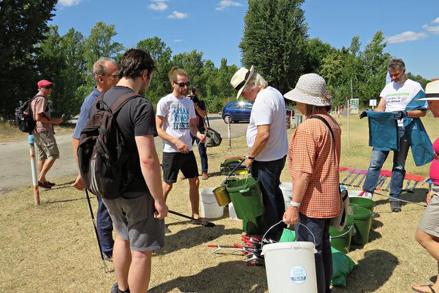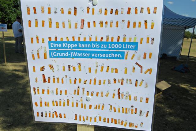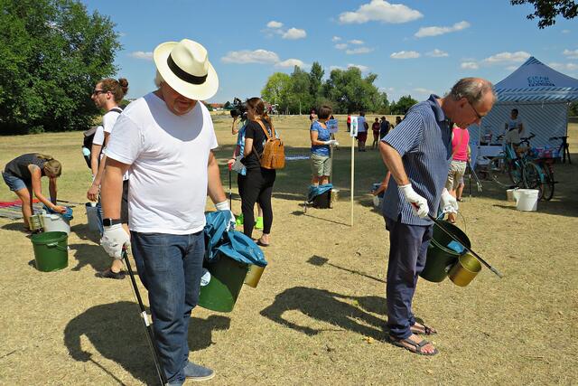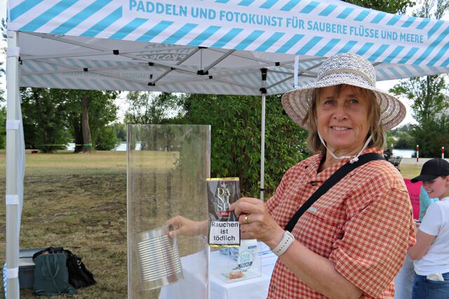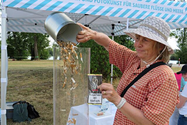 Jeweils zu Wasser – „Alle meine Helfer schwimmen auf dem See!“ - und zu Land wurde ein Team gebildet. Es wurden kostenlos Boote zur Verfügung gestellt. Die skurrilsten Fundstücke sollten alle separat mitbringen zur Sichtung „Ist das Kunst oder kann das weg?“. Auch eine kleine Challenge sollte es anschließend diesbezüglich geben. Sicherheitshinweise: Nur mit Handschuhen arbeiten, denn es könnten scharfkantige Gegenstände dabei sein, und niemals Flaschen aufschrauben, denn darin könnten sich gefährliche Substanzen befinden. Die „Landminensucher“ machten sich auf, die Zigarettenkippen aufzusammeln, die später zur besseren Veranschaulichung in eine große Plexiglasröhre geschüttet werden. Gerade bei dieser Trockenheit und Hitze hatten es der Landtrupp schwerer als die im kühlen Wasser paddelnden Sammler. Also nicht beneidenswert! Aber auch hier wurde der/diejenige mit den meisten Kippen mit einem Preis belohnt. Wer weiß, ob sich da jemand die beiden von Herrn Berkel spendierten Filmfestival-Eintrittskarten holt?