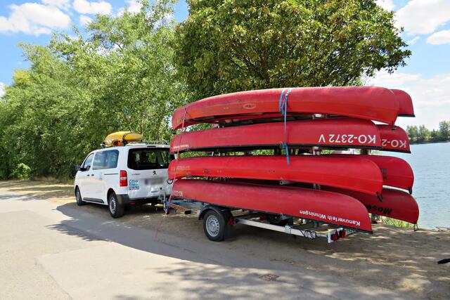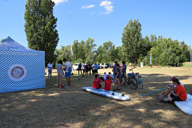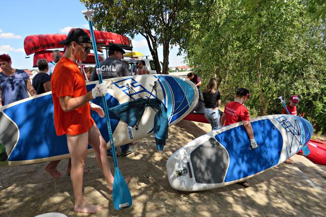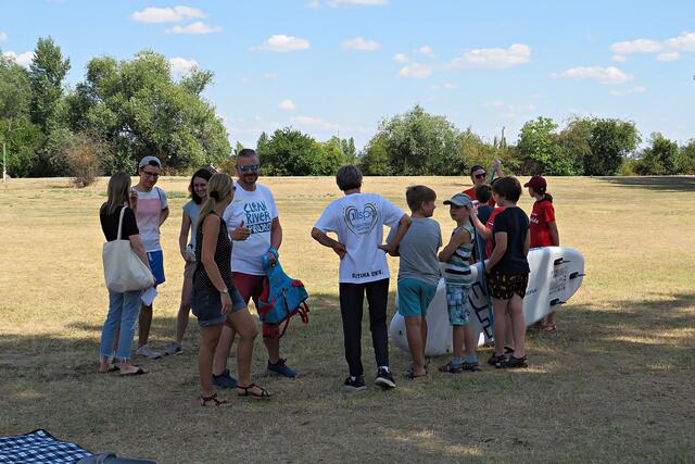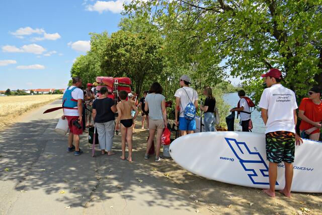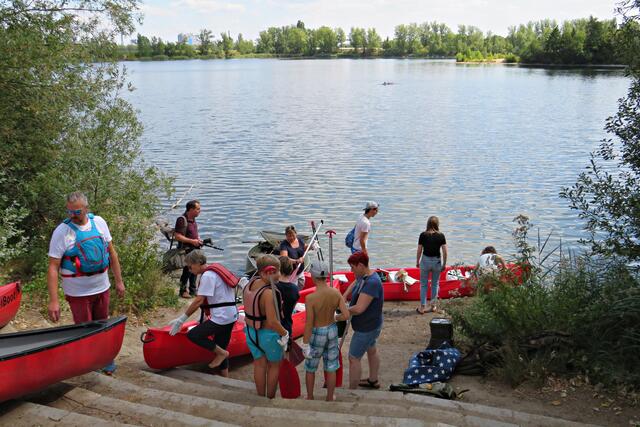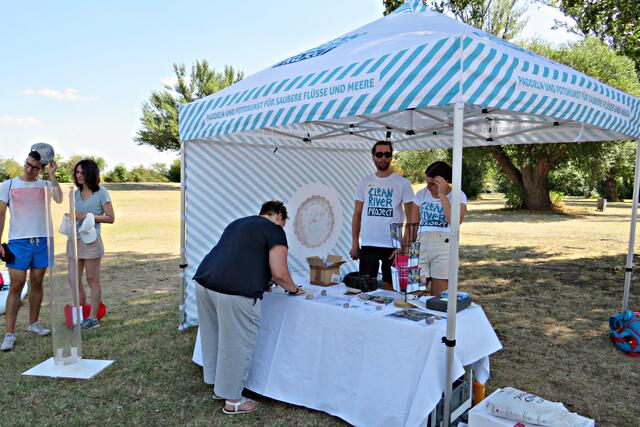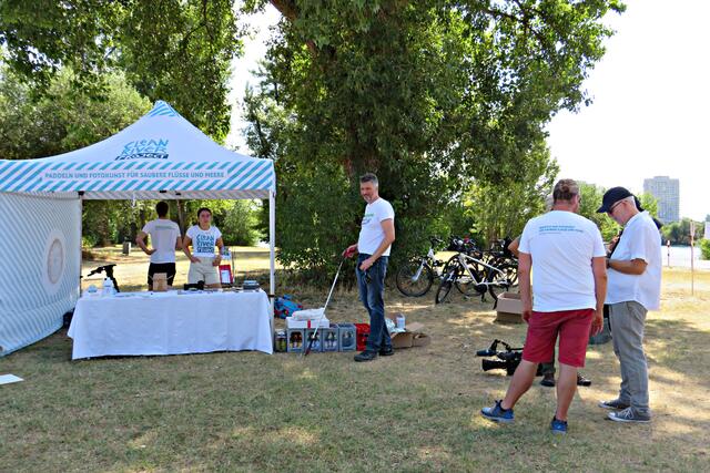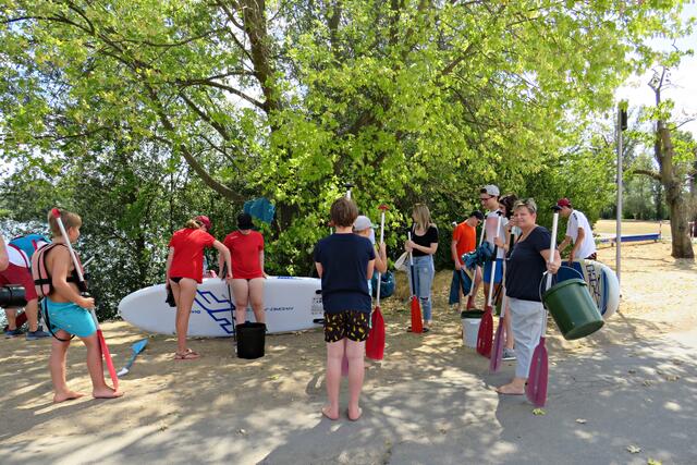 Diese erstmalige groß angelegte Sammlung fand ab 12 Uhr statt. Alles war bereits von den aktiven Helfern des CLEAN RIVER PROJECT aus Winningen und Mitarbeitern der GML vorbereitet worden. Hinweistafeln mit Infos über Umweltsünden, Paddeln, Tüten und Eimer sowie Handschuhe. Marie verteilte Taschenascher aus PET als Kippenaschenbecher und den bekommt jeder, der rauchend vorbeiläuft. Der harte Kern des Fördervereins WSV Ludwigshafen fand sich ein, um mitzuhelfen und hatte sogar den Urlaub verschoben. Und so tummelten sich fleißige Nachwuchswasserballer mit Begleitung auf der Wiese und warteten darauf, dass es los ging. Vom WSV-Vorstand waren Tatjana Bühler und Nadine Kratzer-Wittmann mit dabei. Sie erzählten, dass sie vor 2 Wochen ein Kinderfest veranstaltet hatten, das eigentlich vor 2 Jahren hätte stattfinden sollen. Da fuhren sie auf Paddlerboards auch auf dem Begütenweiher und hatten dann einen gemütlichen Ausklang beim WSV. Ab 7 Jahren kann man dem Verein beitreten und sollte natürlich gut schwimmen können.