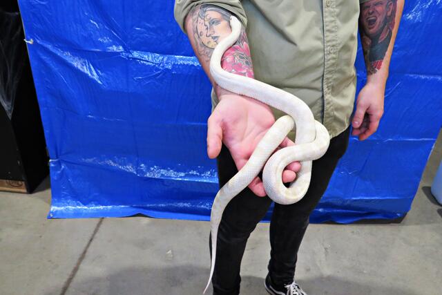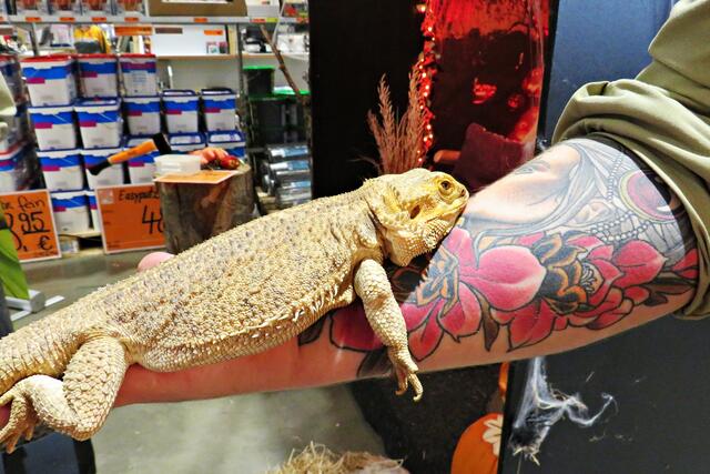Nachdem sich die Kinder am gegenüberliegenden Tisch von Kunststudentin Sandra und Sarah Zerm im Halloween-Style schminken ließen, wollten sie sich in der gruselig anmutenden Fotobox noch mit allerlei Krabbel- und Kriechtieren fotografieren lassen. Die Schlange war lang, also die anstehende Besucherschlange, die echten Schlangen eher klein. Und es gab fünf Tiere, mit denen man sich ablichten lassen konnte: Bartagame, Albino-Kornnatter, Kornnatter, Königspython, Kraushaar-Vogelspinne. Die Vogelspinne ist bereits 18 Jahre alt, kommt aus Südamerika und heißt „Mona“. Alle mitgebrachten Tiere hatten ihre „Arbeitszeiten“ mit langen Ruhezeiten von ca. 1 Stunde, denn dafür sorgten nicht nur der Marktleiter Heiko Ottosen mit ein paar unterstützenden Angestellten, sondern auch die beiden Tierpfleger vom Reptilium. Diesen Trubel sind sie einfach nicht mehr gewohnt nach dem langen Lockdown. Wenn die Tierpfleger merkten, dass die Tiere gestresst wirkten, kamen sie zurück in ihre Box.