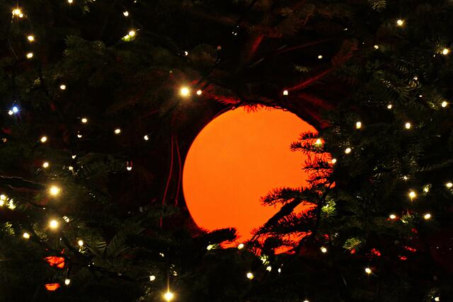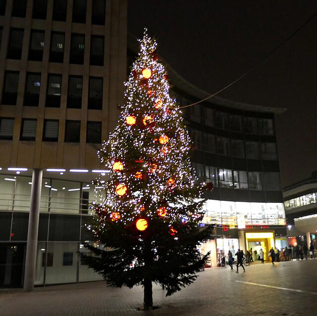 - Orangefarbene Weihnachtskugel am Christbaum Rathauscenter