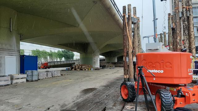 Momentan werden also die Stütztürme gebaut, die verhindern, dass die Hochstraße beim Abriss unkontrolliert einstürzt. Die Herausforderung: „Das muss alles händisch eingebaut werden“, erklärt Feldmann. Über 1.000 Tonnen Stahlprofile müssen auf diesem Wege eingebaut werden. Hier ist der Regen ebenfalls ein Problem. Die Profile messen knappe sechs Meter und können deshalb nicht ohne weiteres in einem Unterstand oder Container – also im Trockenen – verarbeitet werden. Die verwendeten Plasmaschneider reagieren sehr empfindlich auf die Witterung. Die einfachste Lösung wäre natürlich, die Stahlstreben unter der noch stehenden Hochstraße zu schneiden. Das allerdings geht aus sicherheitstechnischen Gründen nicht, der Aufenthalt unter der Brücke ist verboten.