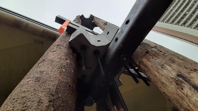 - Stütz-Turm von unten: Sechs Holzstämme werden mittels eines Beton-Zahnrades an sechs Meter langen Stahlsprießen verschraubt
