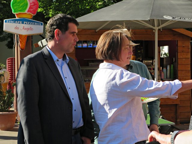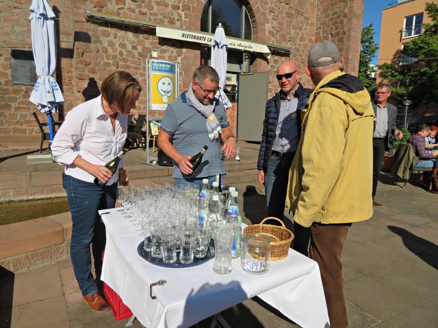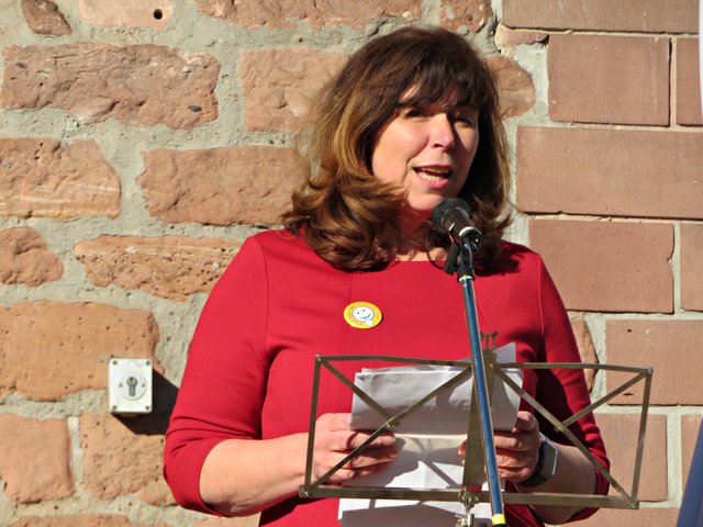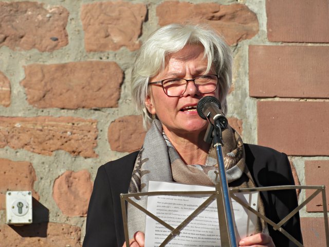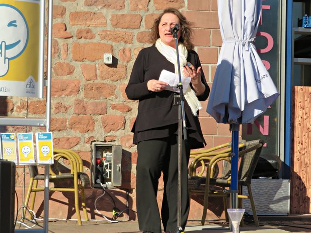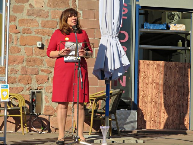 In den Grußworten von Frau Oberbürgermeisterin Jutta Steinruck wurde deutlich, dass sich viele Menschen wünschen würden, einen Ort der Ruhe zu finden. Es sei nicht nötig, aus der Stadt zu „fliehen“, denn auch in der Stadt Ludwigshafen gebe es Stätten für Erholungssuchende. Sie findet, wir sitzen hier an einem Ort, wo man Ruhe finden kann. Der Hack-MuseumsgARTen sei in der Nähe und der plätschernde Brunnen würde ebenfalls äußerst beruhigend wirken. Sie habe die Bilder nur im Internet gesehen und sei begeistert von den aufgenommenen großen Bildern hier am Platz.